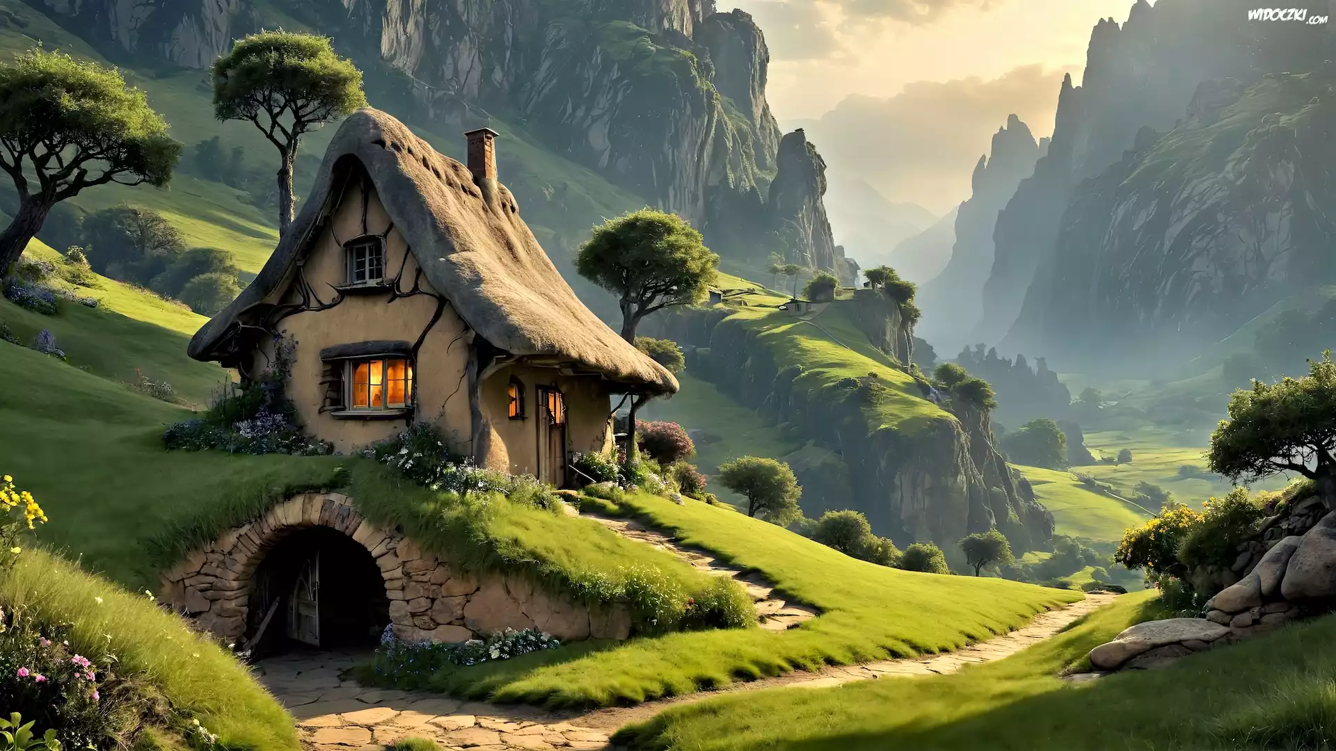 Góry, Dolina, Dom, Drzewa, Ścieżka, Grafika
