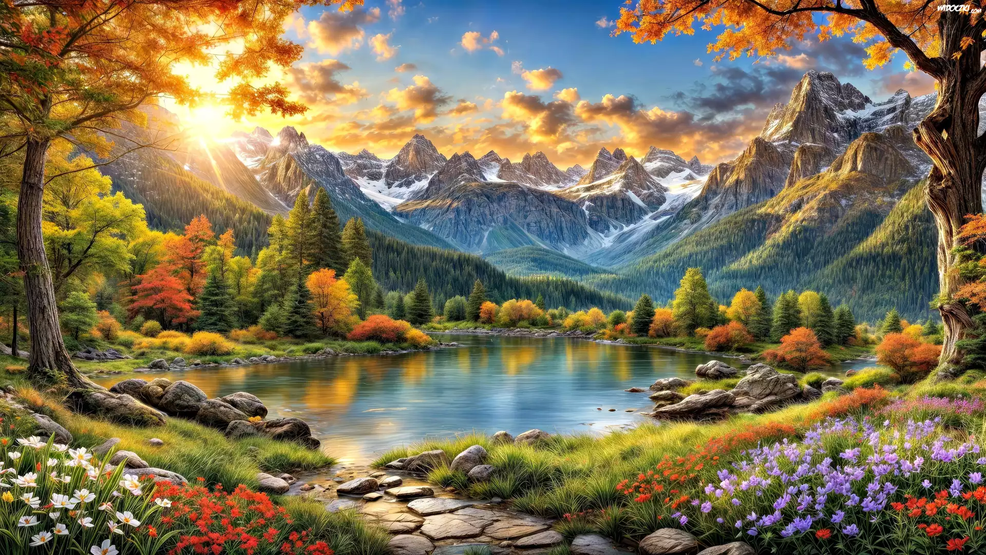 Kwiaty, Staw, Góry, Drzewa, Jesień, Grafika
