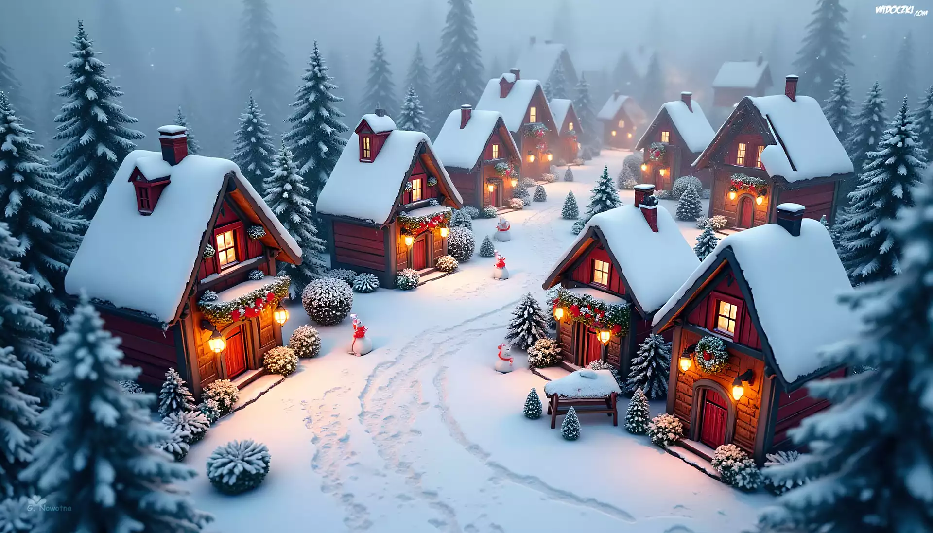 Zdj臋cia, Domy, Wioska, Zima, Drzewa, Choinki, Grafika