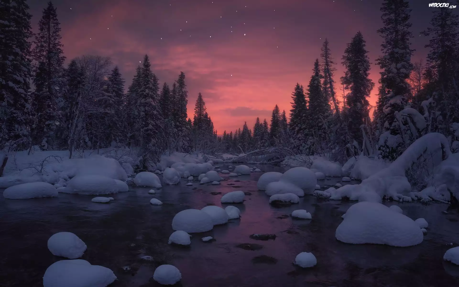 Zdjęcia, Zima, Rzeka, Ośnieżone, Drzewa, Noc, Gwiazdy