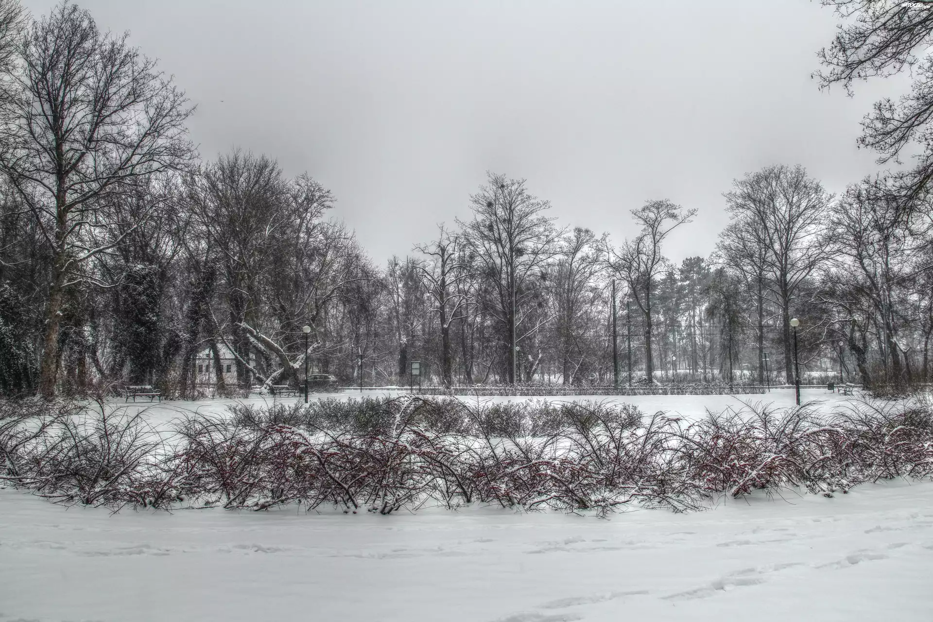 Zdjęcia, Zima, Drzewa, Krzewy, Park, Plac Spiski, Poznań, HDR