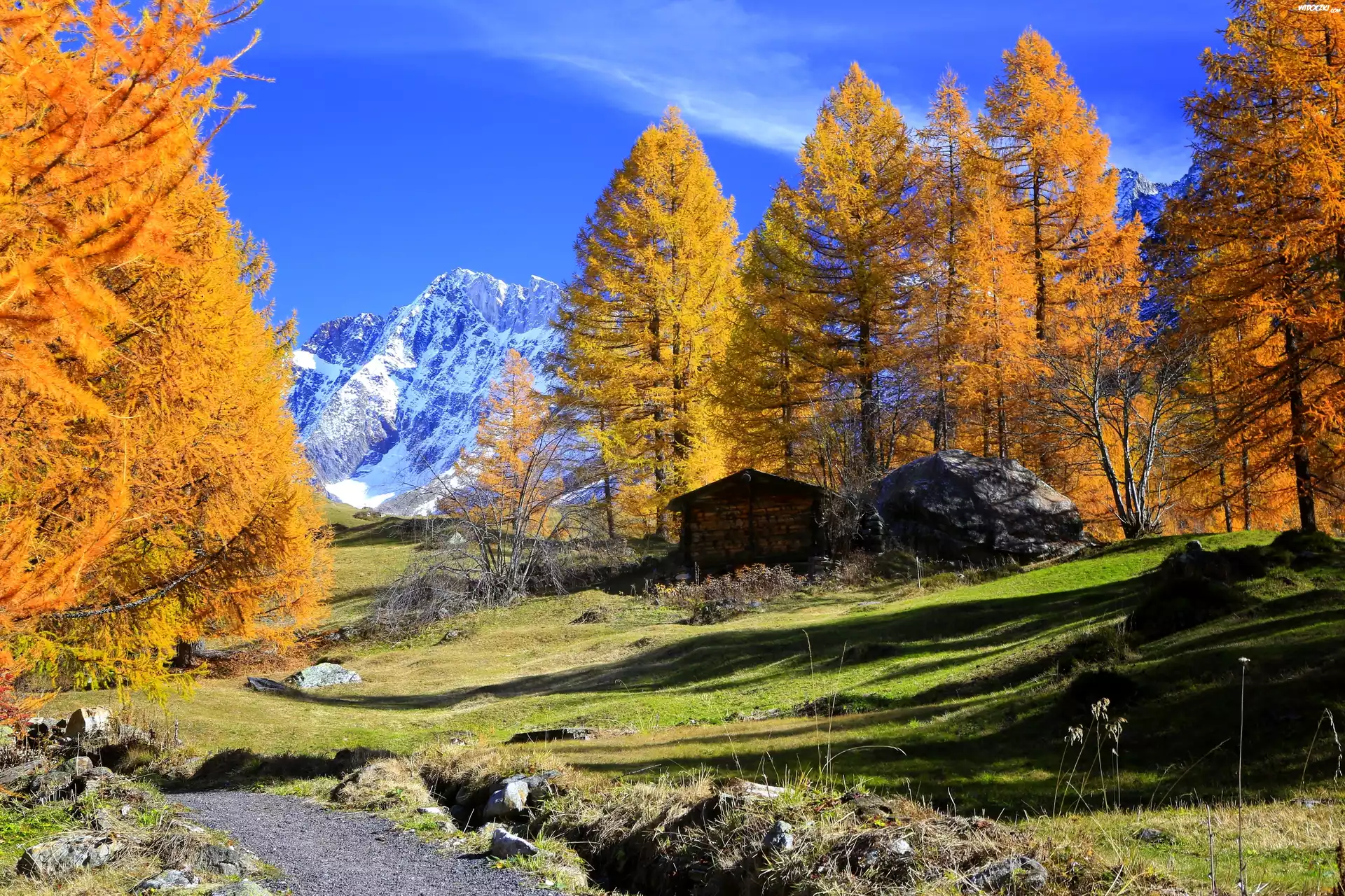 Zdjęcia, Jesień, Drzewa, Góry, Wzgórza, Domek, Kamienie,Droga