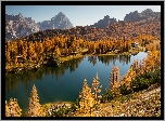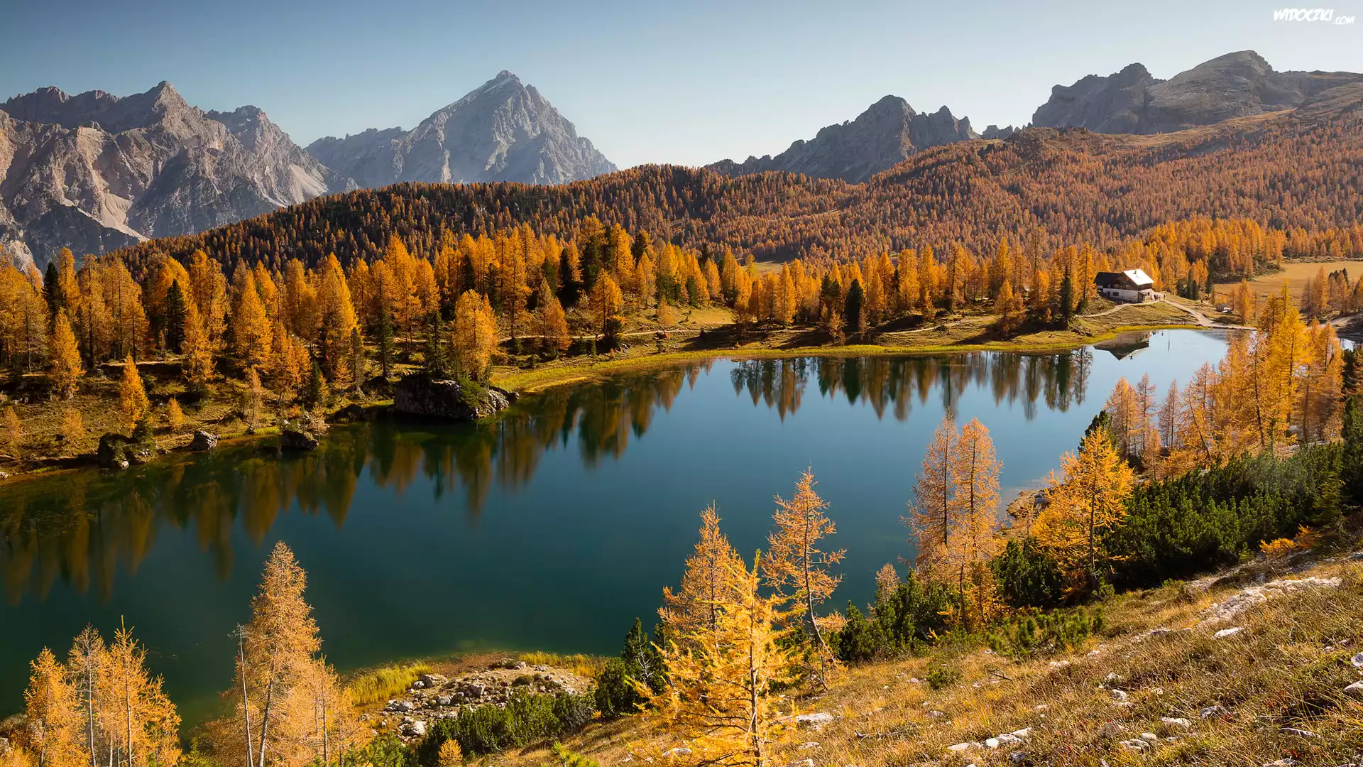 Zdjęcia, Jezioro, Federa Lake, Góry, Dolomity, Lasy, Drzewa, Jesień, Prowincja Belluno, Włochy