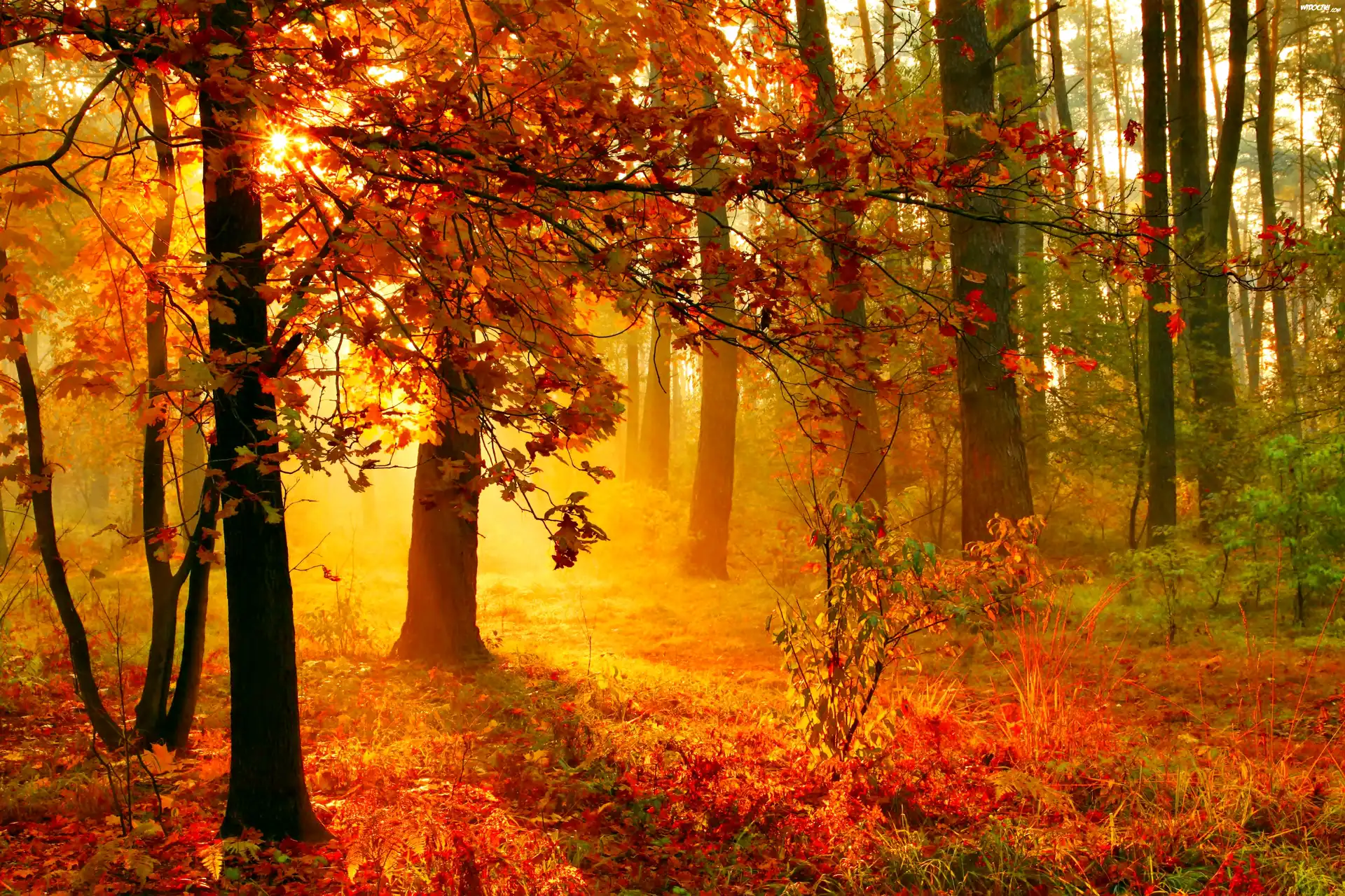 Las, Drzewa, Ścieżka, Poranne, Promienie, Słońca, Mgła, Jesień