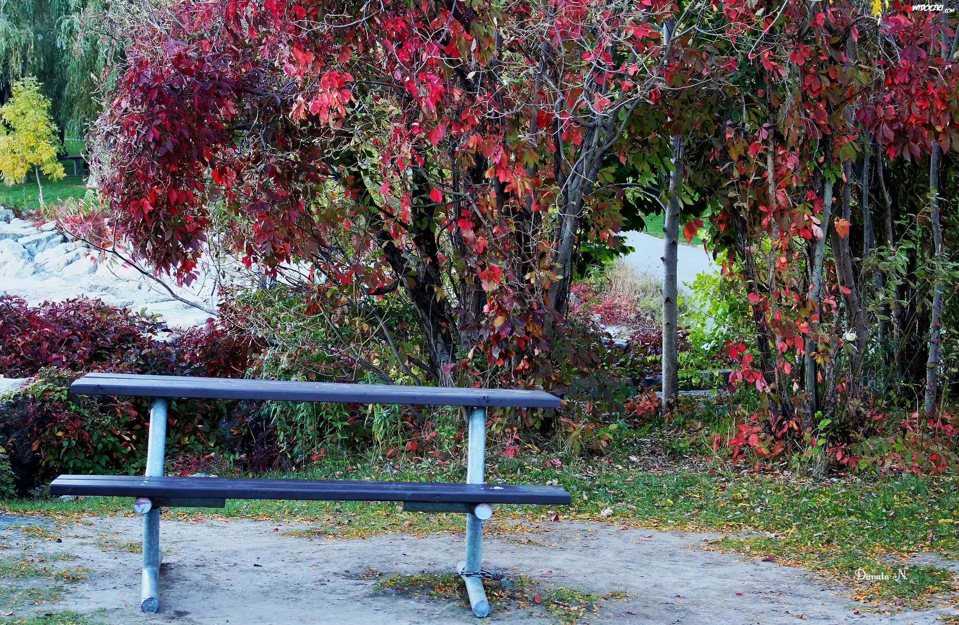 Zdjęcia, Jesień, Drzewa, Liście, Ścieżka, Stół, Piknikowy, Park