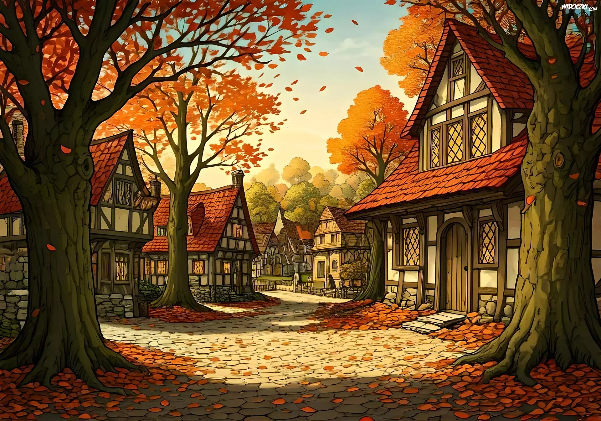 Zdjęcia, Jesień, Domy, Ulica, Drzewa