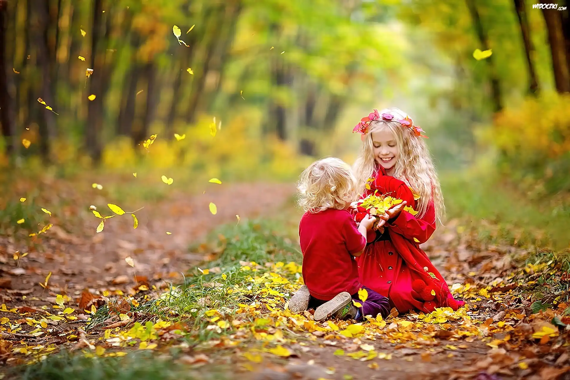 Zdjęcia, Jesień, Drzewa, Liście, Mały, Chłopiec, Dziewczynka, Wianek