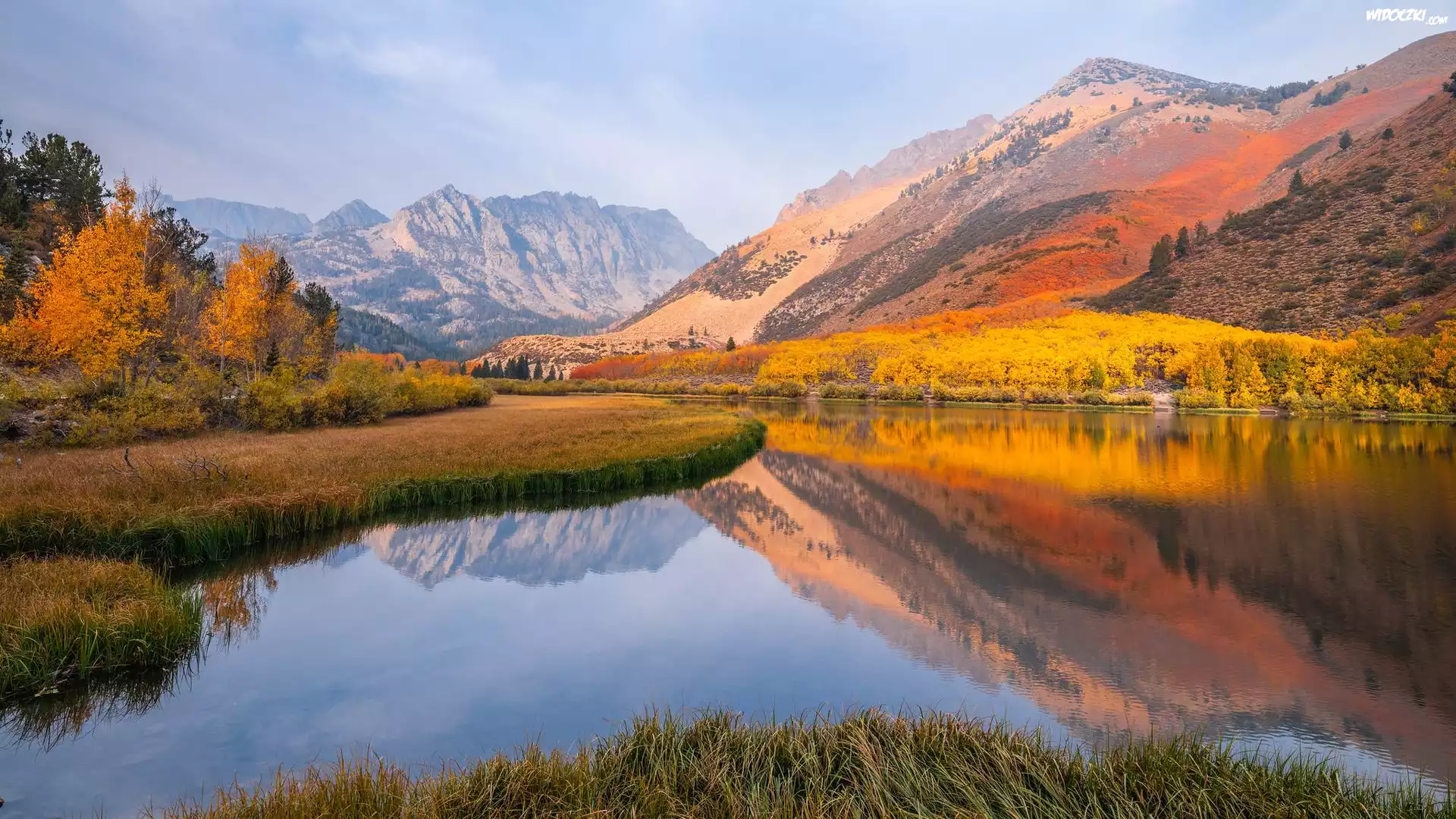 Jesień, Region, Eastern Sierra, Góry, Drzewa, Jezioro, North Lake, Kalifornia, Stany Zjednoczone