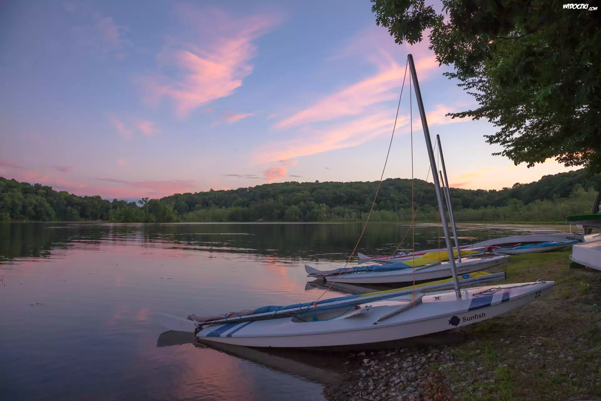 Zdjęcia, Żaglówka, Jezioro, Drzewa, Brzeg