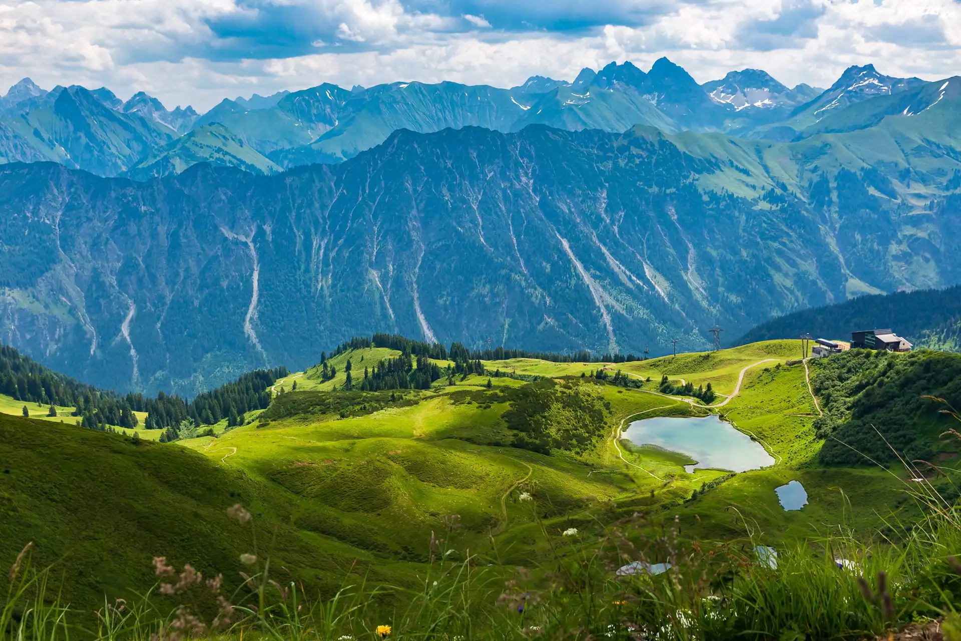Niemcy, Bawaria, Alpy Bawarskie, Góry, Las, Drzewa, Jezioro, Polana, Wzgórza, Zieleń