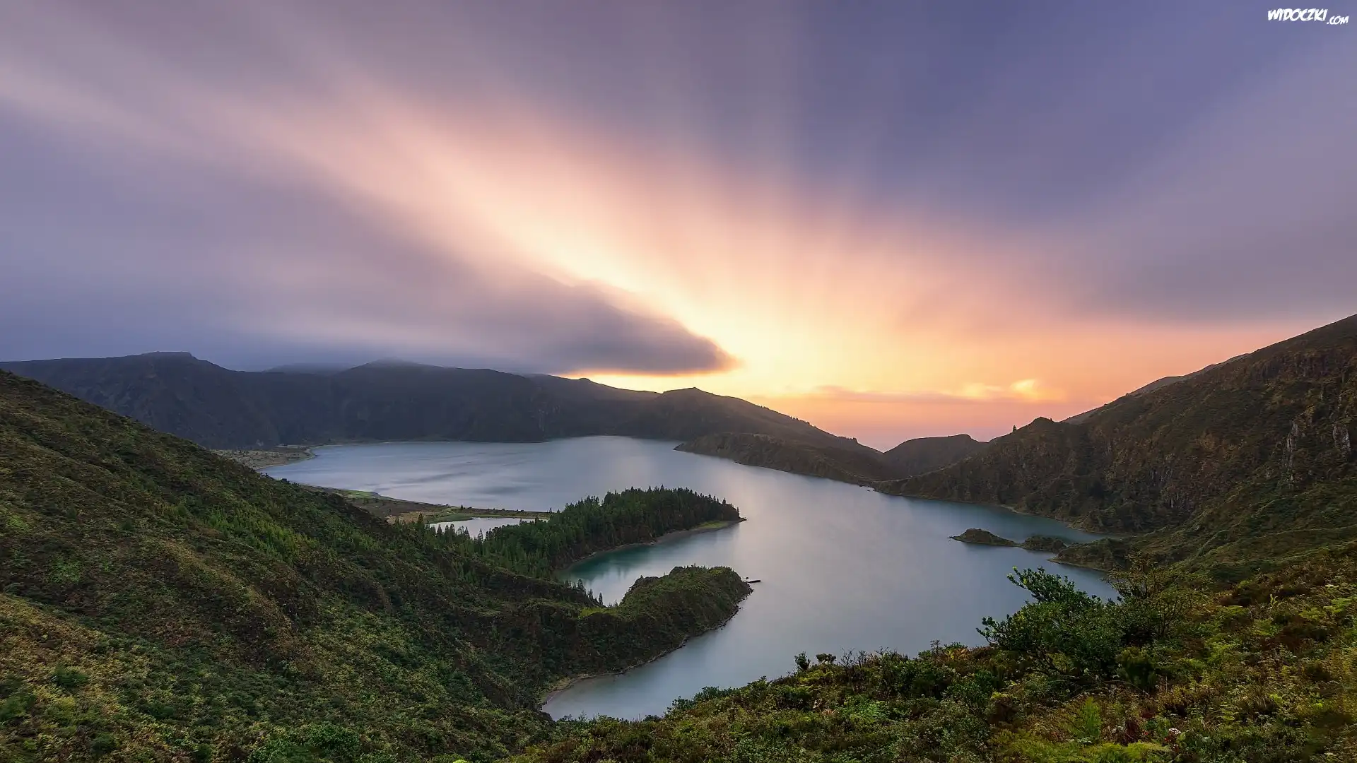 Zdjęcia, Jezioro, Lagoa do Fogo, Drzewa, Lasy, Góry, Ponta Delgada, Wyspa Sao Miguel, Azory, Portugalia