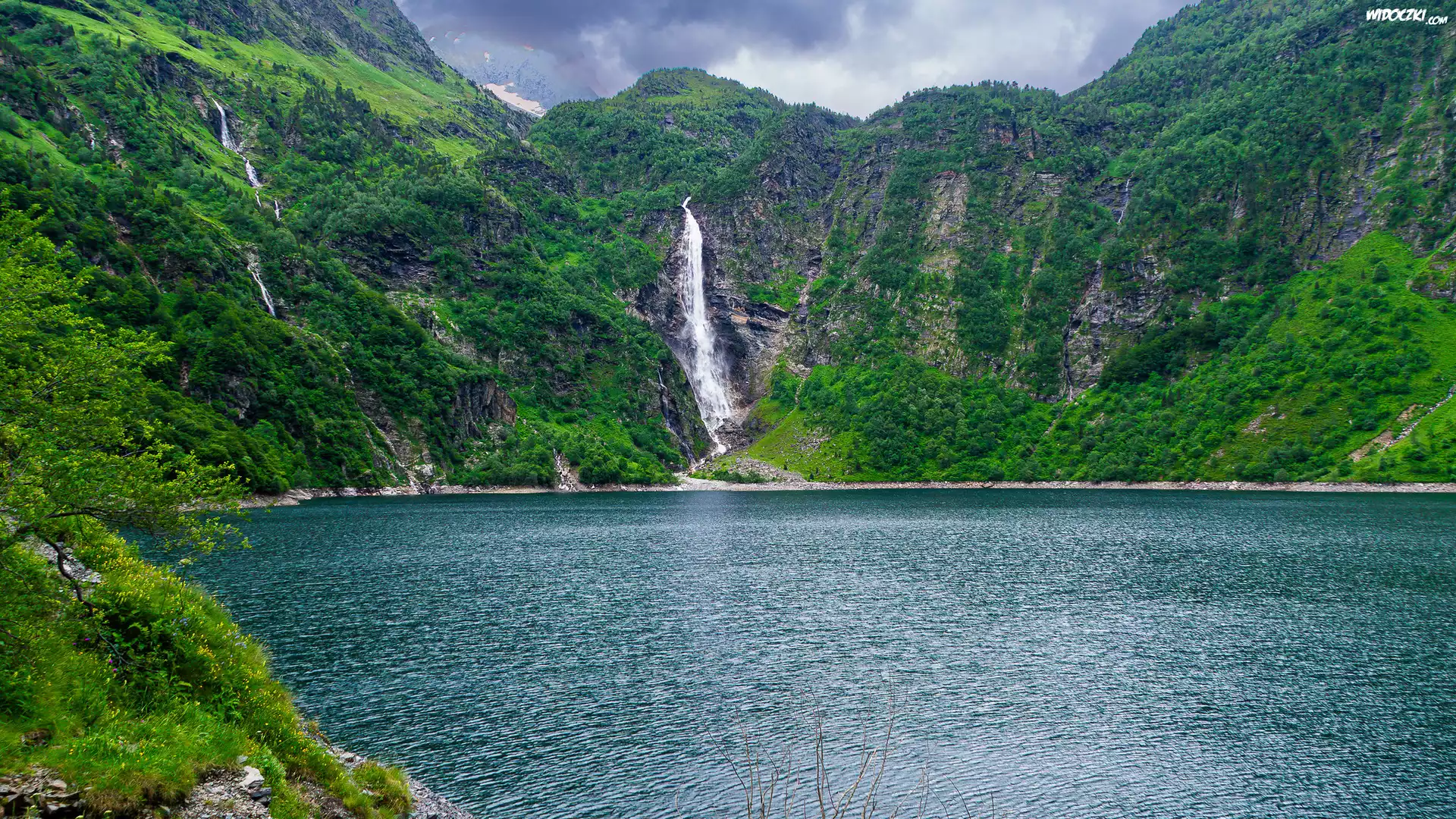 Zdjęcia, Jezioro, Wodospad, Góry, Drzewa