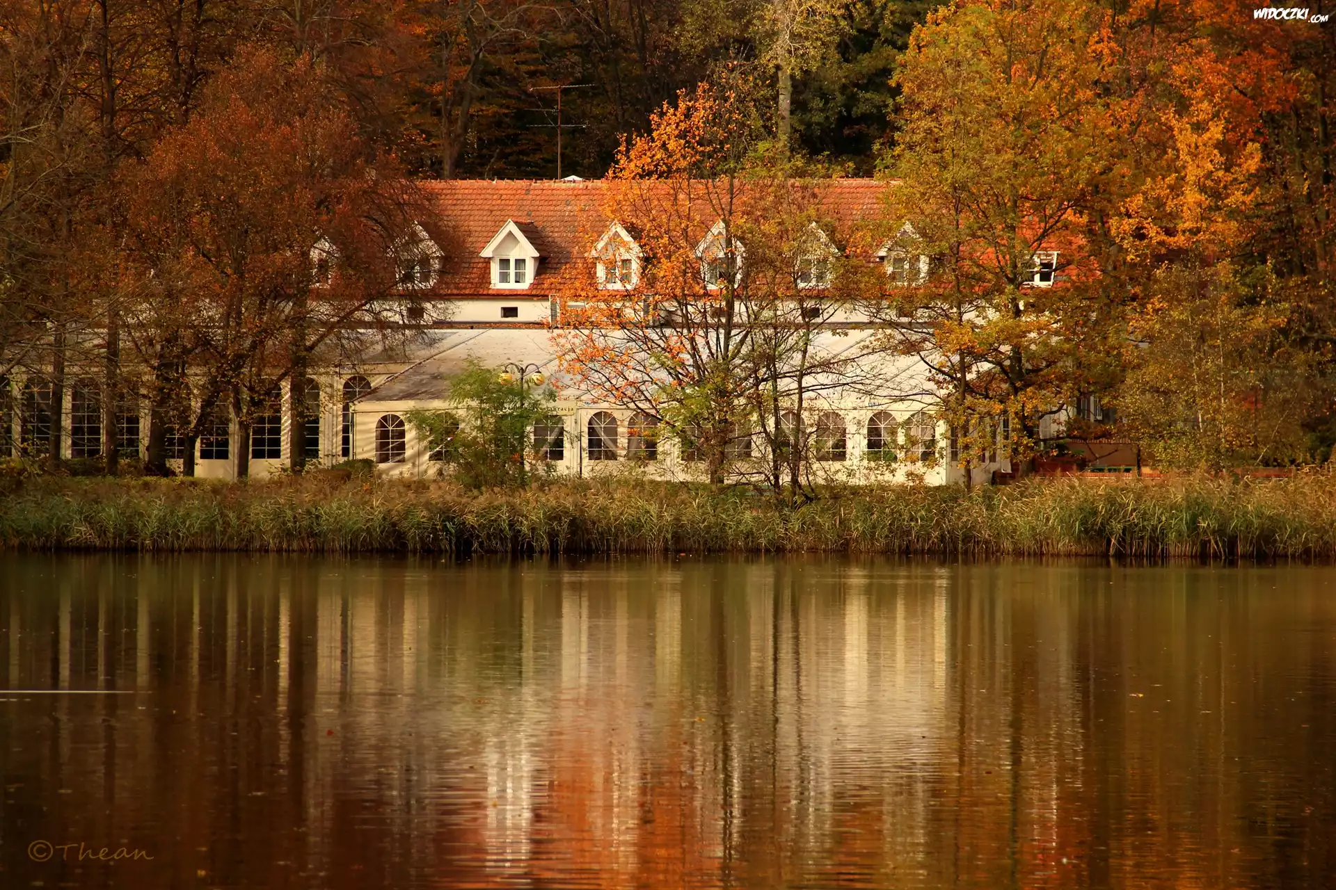 Jezioro, Drzewa, Odbicie, Restauracja Meridian, Poznań, Jesień