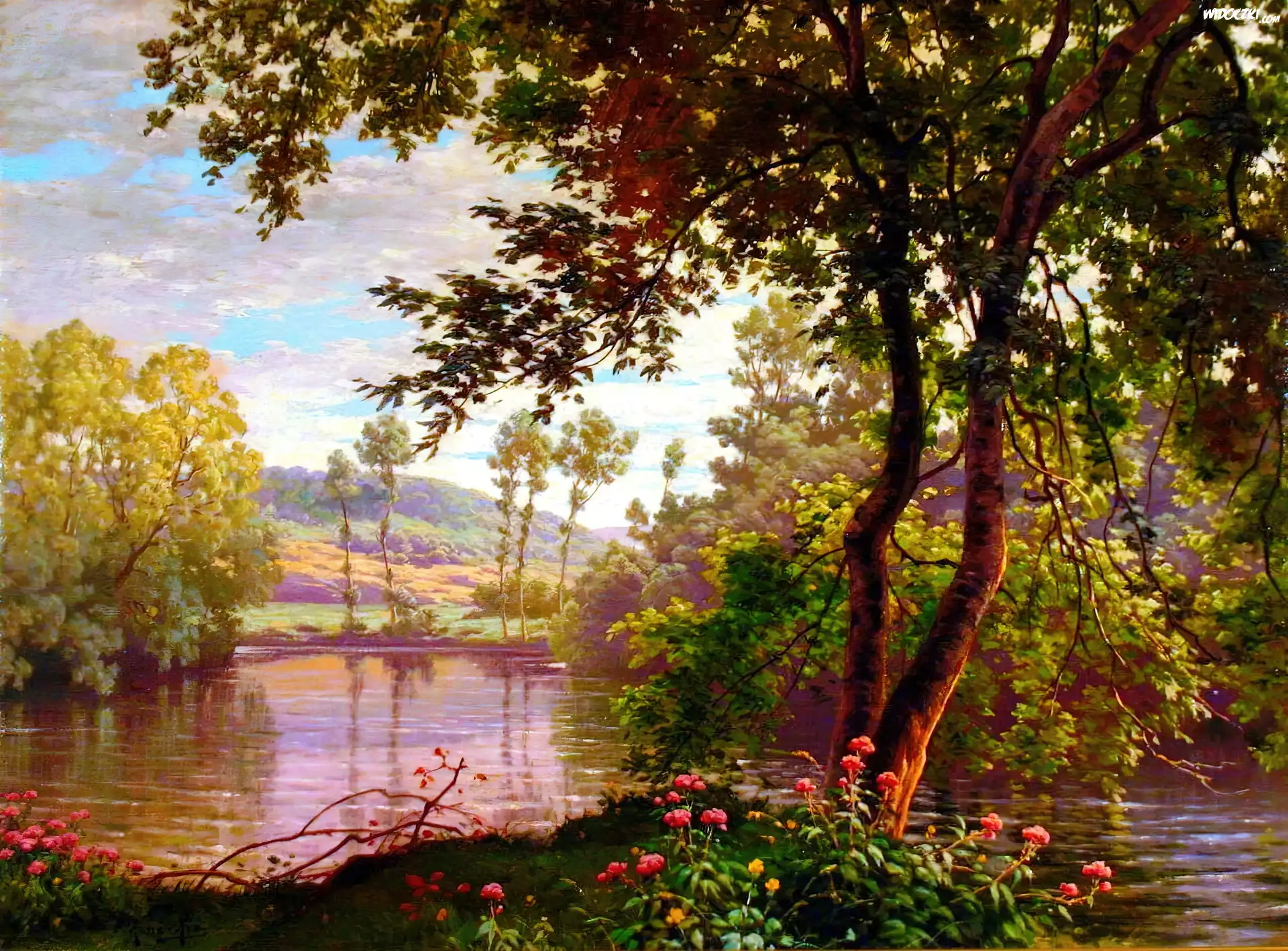 Zdj臋cia, Jezioro, Drzewa, Kwiaty