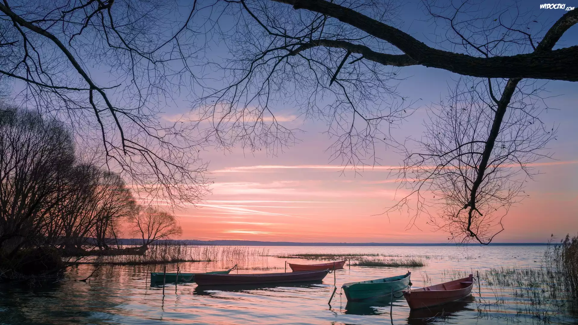 Zachód słońca, Łódki, Drzewa, Gałęzie, Jezioro