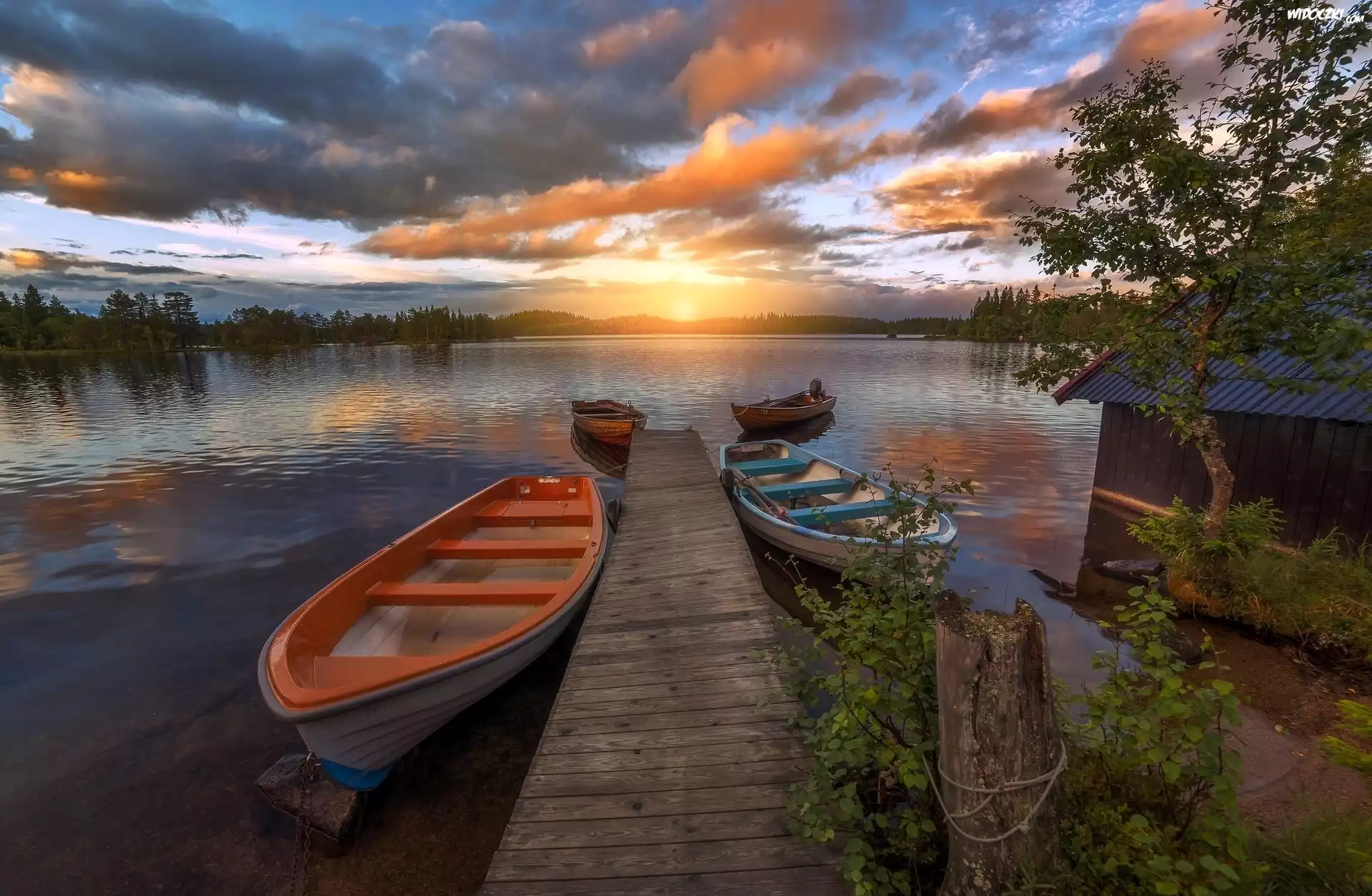 Zdjęcia, Jezioro, Drzewa, Dom, Pomost, Łódki, Wschód, Słońca