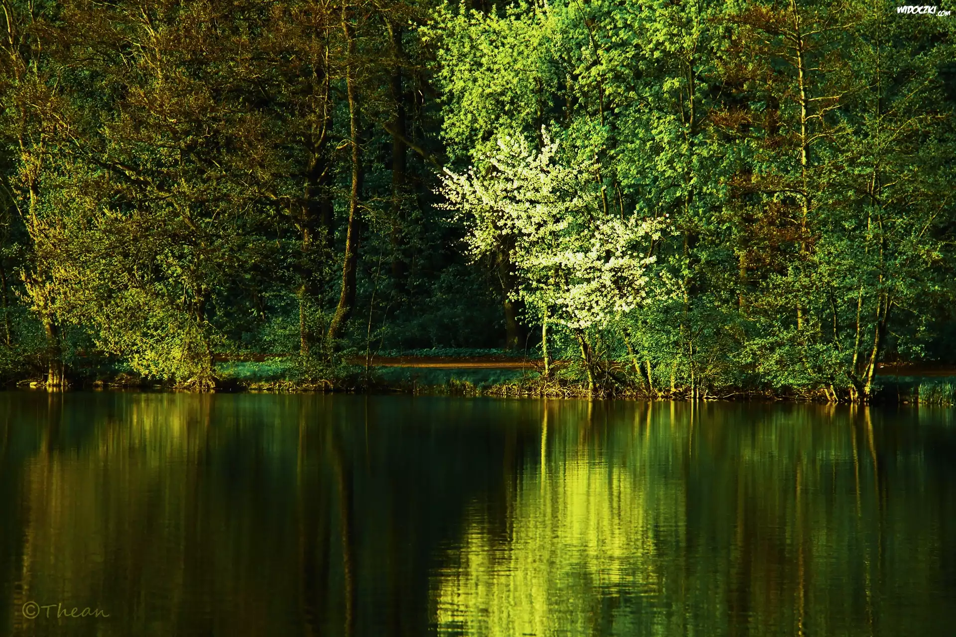 Jezioro, Drzewa, Wiosna