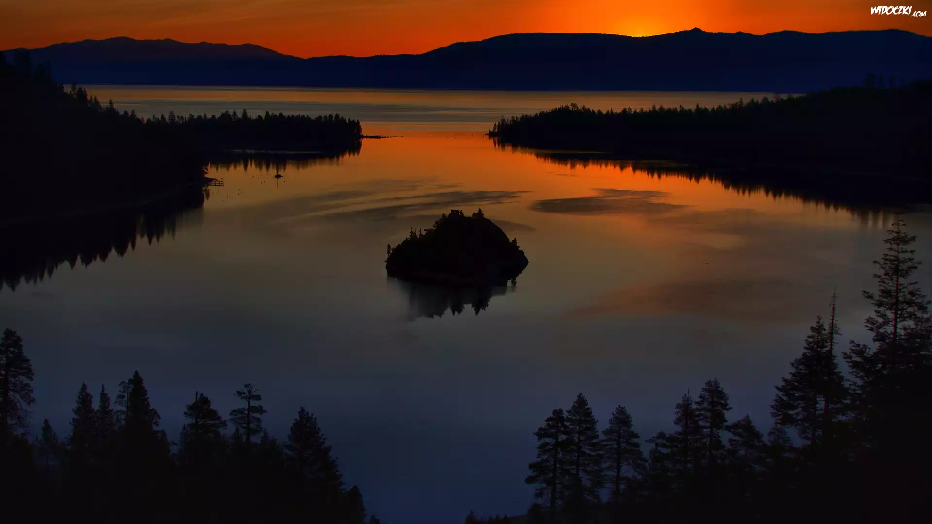 Zdjęcia, Drzewa, Wzgórza, Jezioro, Zmierzch
