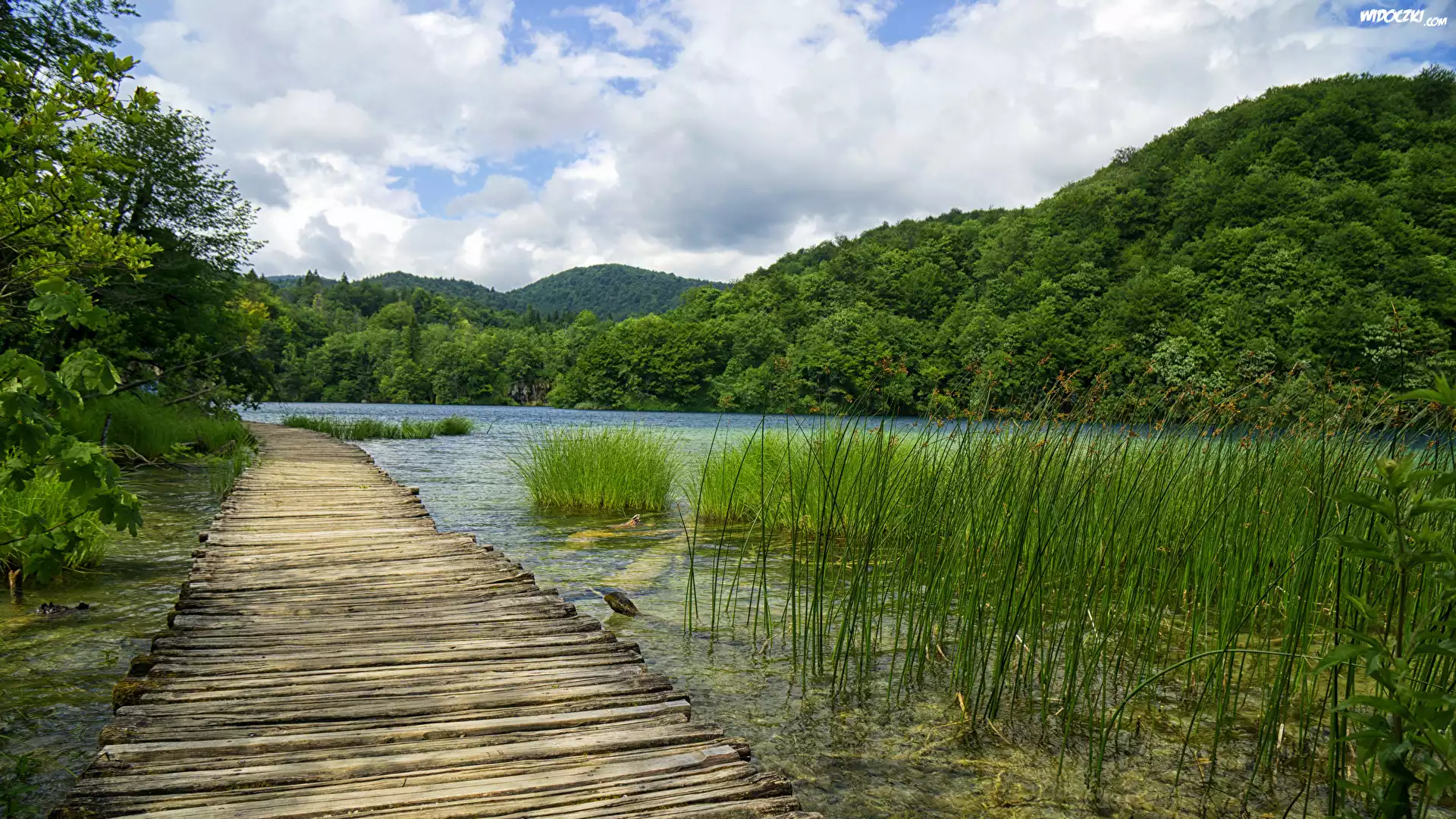 Zdjęcia, Wzgórze, Lasy, Drzewa, Trawa, Jezioro, Pomost, Park Narodowy Jezior Plitwickich, Chorwacja