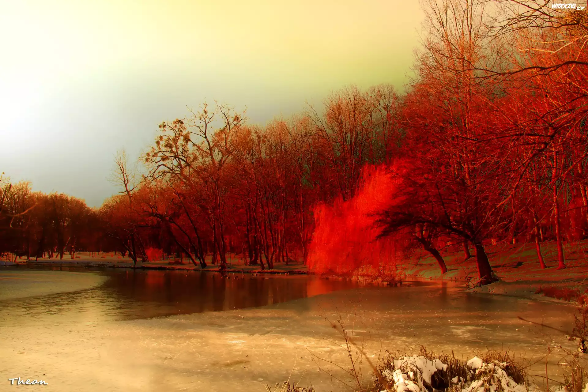 Zdj臋cia, Jezioro, Drzewa, Zima