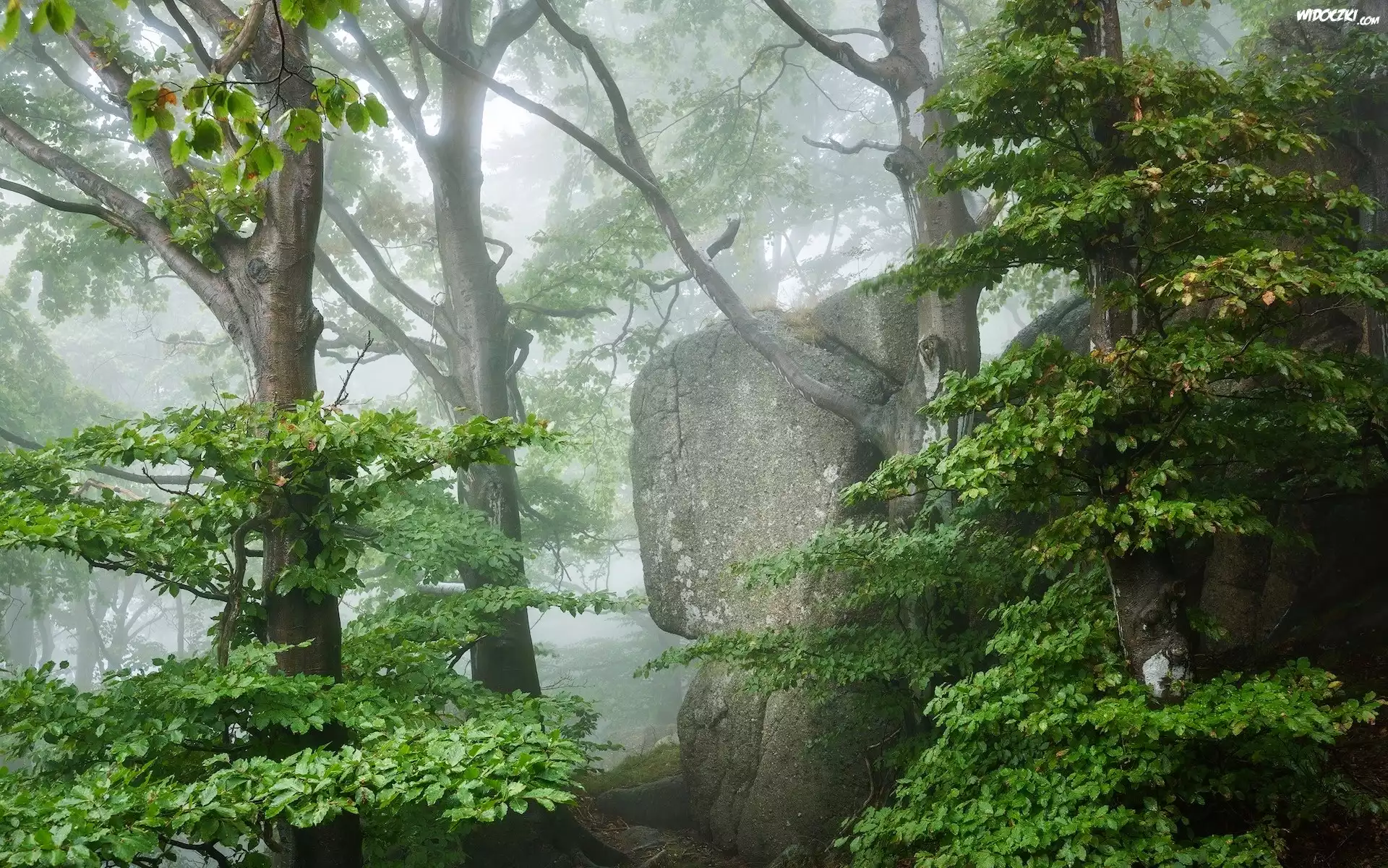 Zdjęcia, Las, Drzewa, Kamień, Skała, Mgła