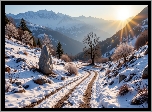 Zdjęcia, Zima, Góry, Śnieg, Drzewa, Droga, Kamień