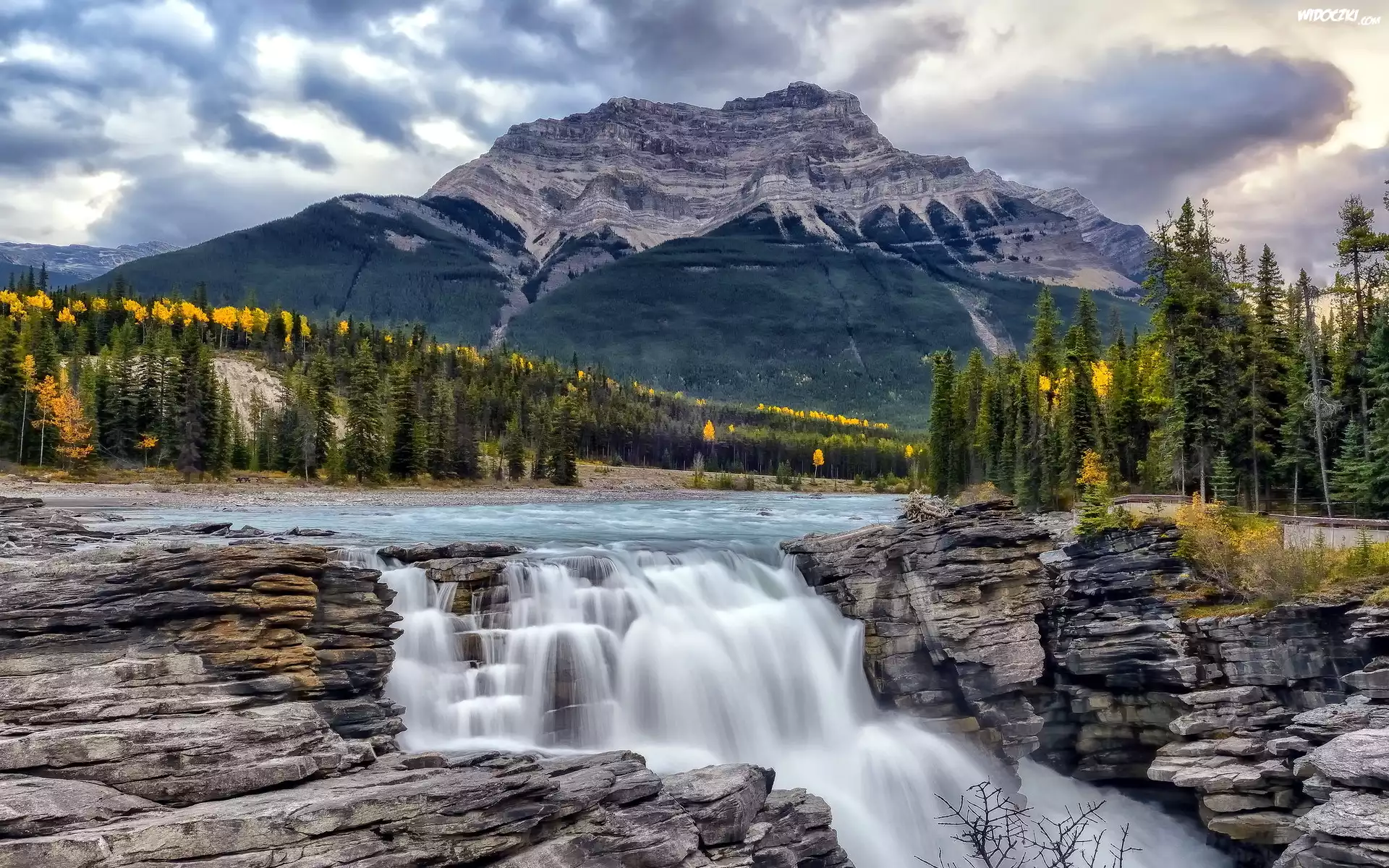 Zdjęcia, Kanada, Park Narodowy Jasper, Góry, Drzewa, Rzeka Athabasca, Wodospad Athabasca Falls, Skały