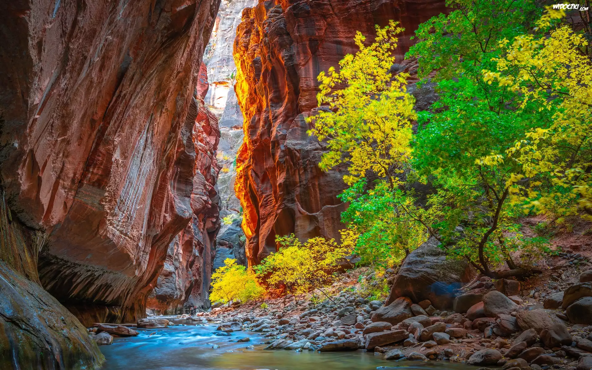 Kanion, Rzeka, Virgin River, Drzewa, Kamienie, Skały, Park Narodowy Zion, Stan Utah, Stany Zjednoczone |
