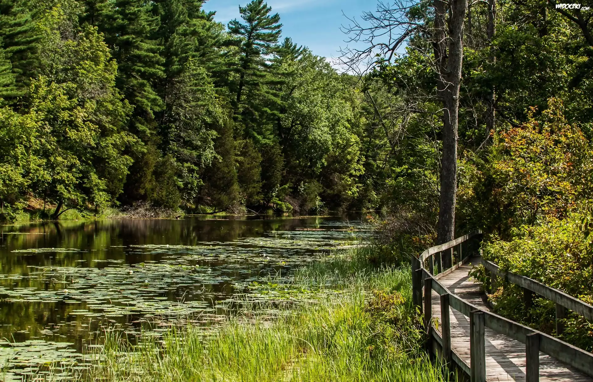 Zdjęcia, Kładka, Drzewa, Jezioro