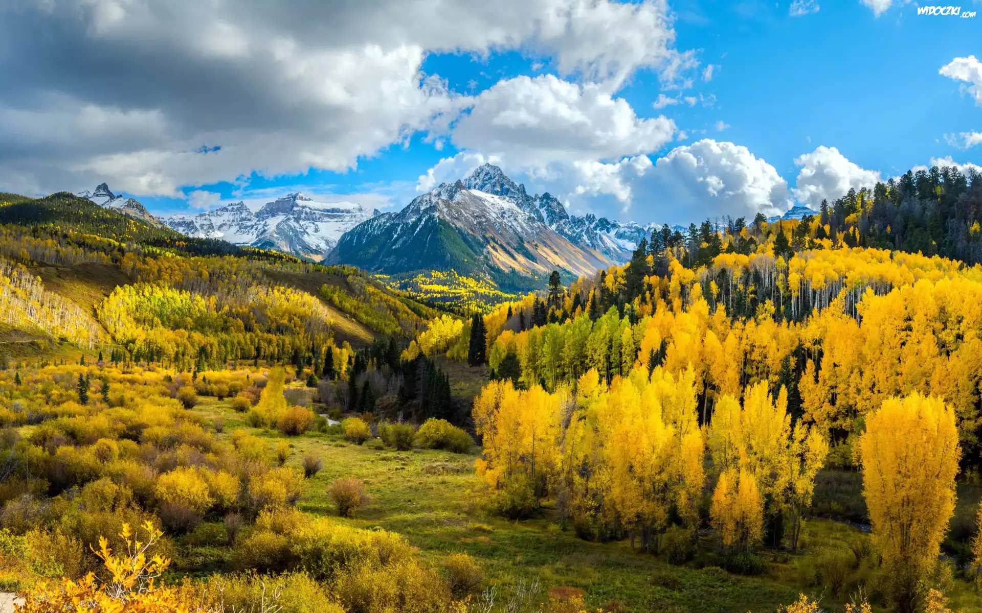 Stany Zjednoczone, Kolorado, Szczyt, Mount Sneffels, Góry Skaliste, Lasy, Drzewa, Jesień, Chmury