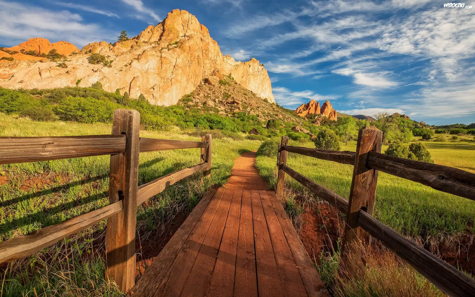Zdjęcia, Stany Zjednoczone, Kolorado, Garden of the Gods, Góry, Skały, Drzewa, Kładka, Mostek