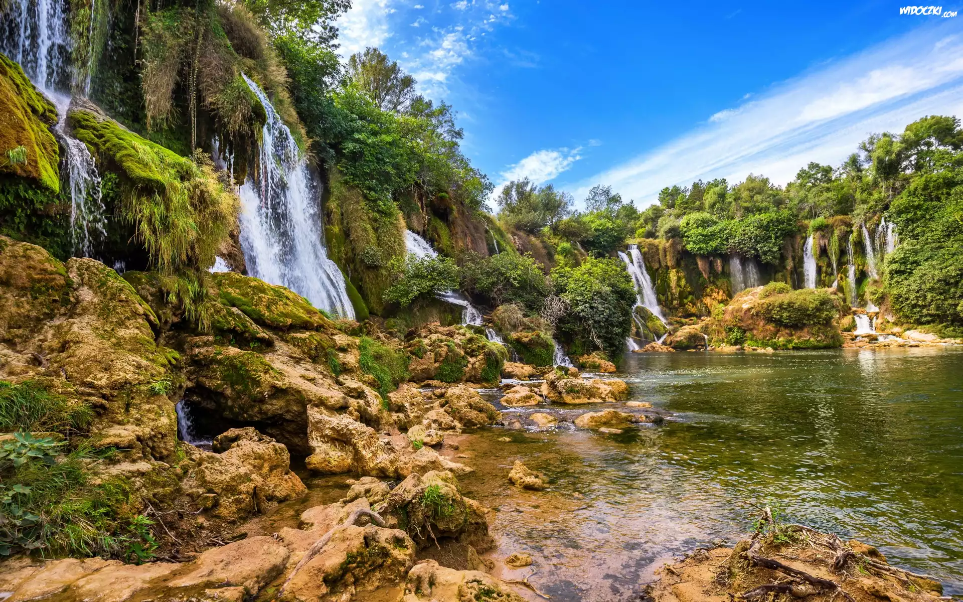 Zdjęcia, Bośnia i Hercegowina, Wodospady Kravica, Rzeka Trebižat, Kamienie, Drzewa