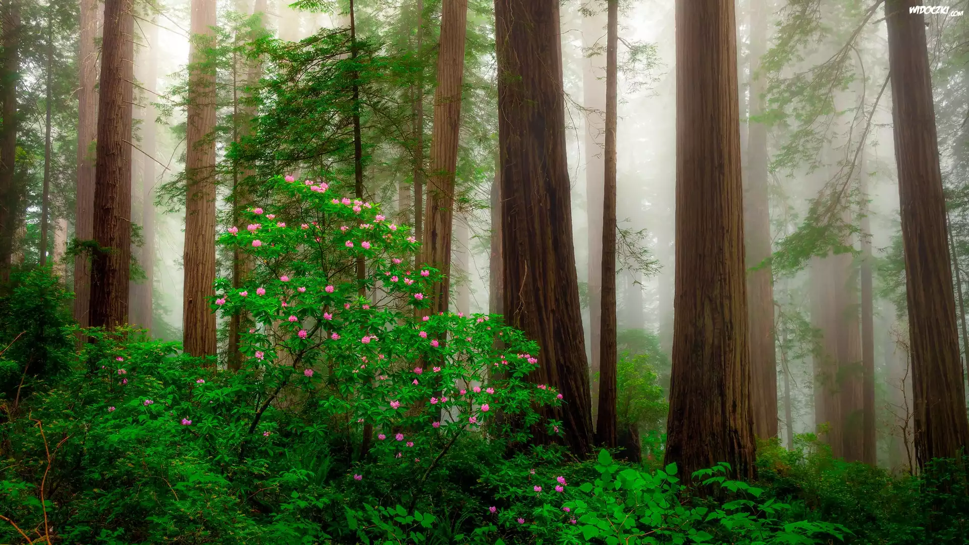 Zdjęcia, Stany Zjednoczone, Kalifornia, Park Narodowy Redwood, Drzewa, Krzewy, Różanecznik, Kwiaty, Mgła