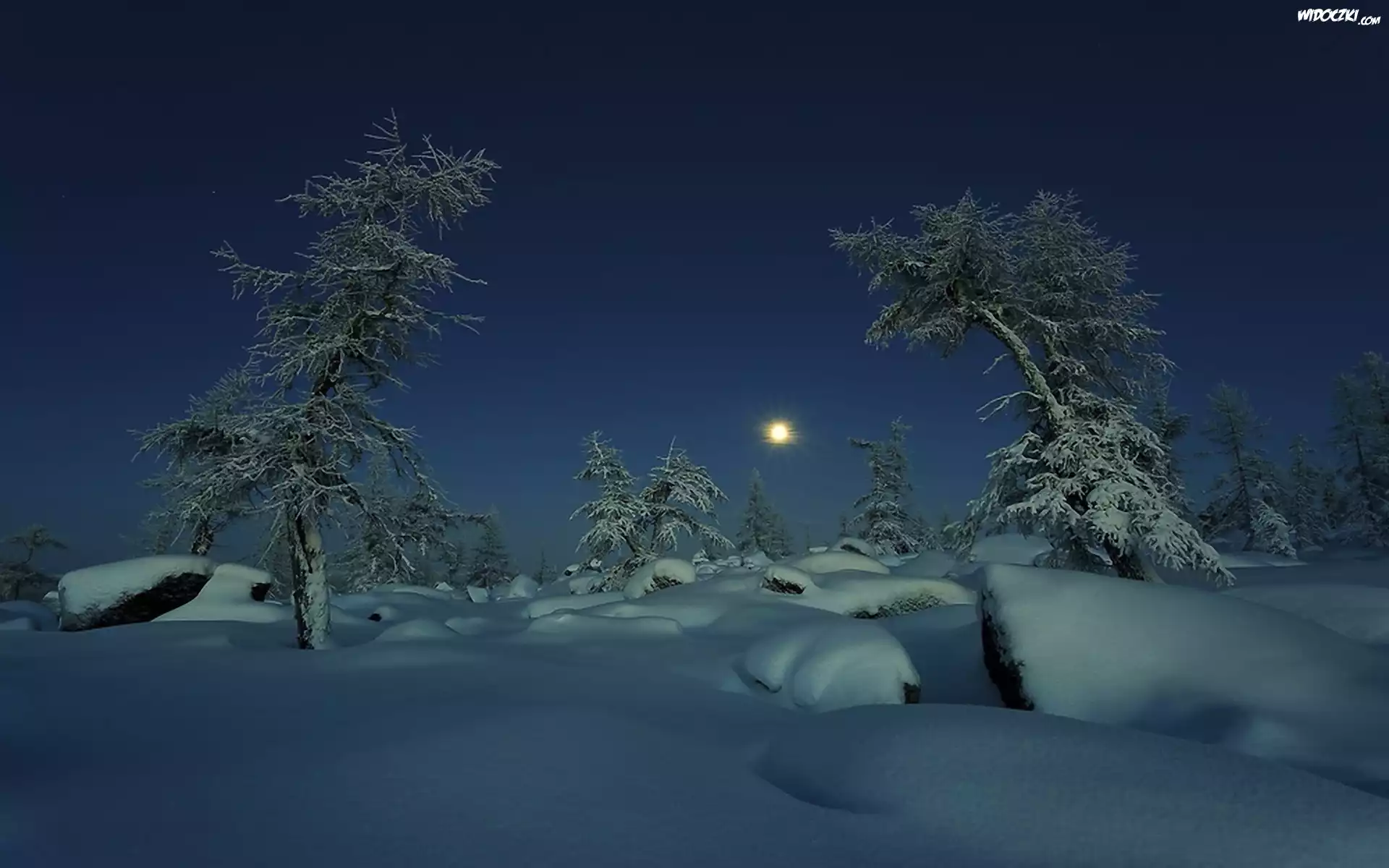 Zdjęcia, Księżyc, Drzewa, Śnieg