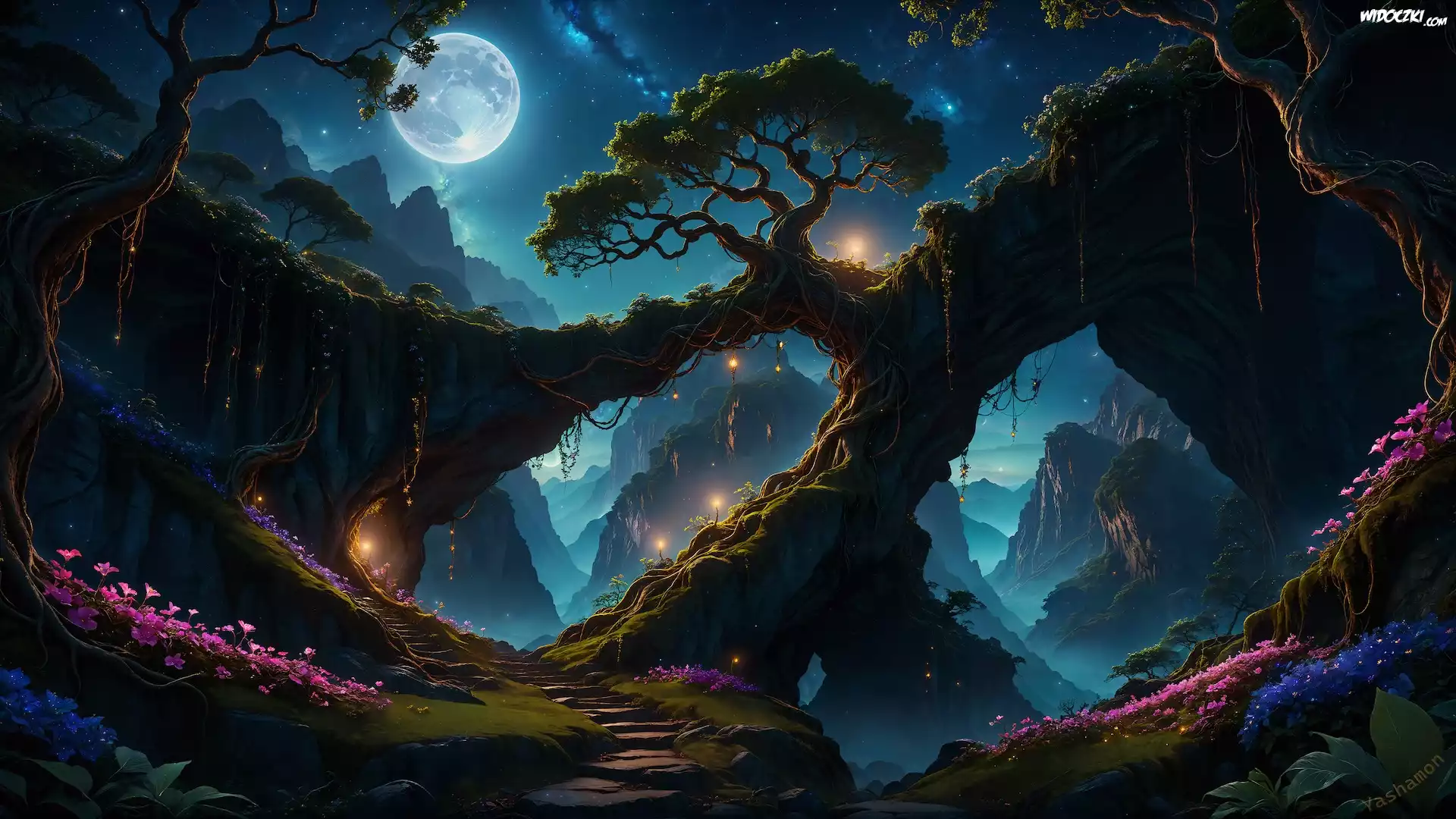 Zdjęcia, Skały, Noc, Księżyc, Drzewa, Droga, Kwiaty, Fantasy
