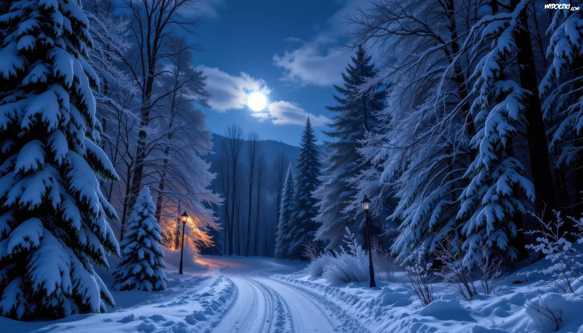 Zdjęcia, Zima, Droga, Ośnieżone, Drzewa, Światło, Księżyc