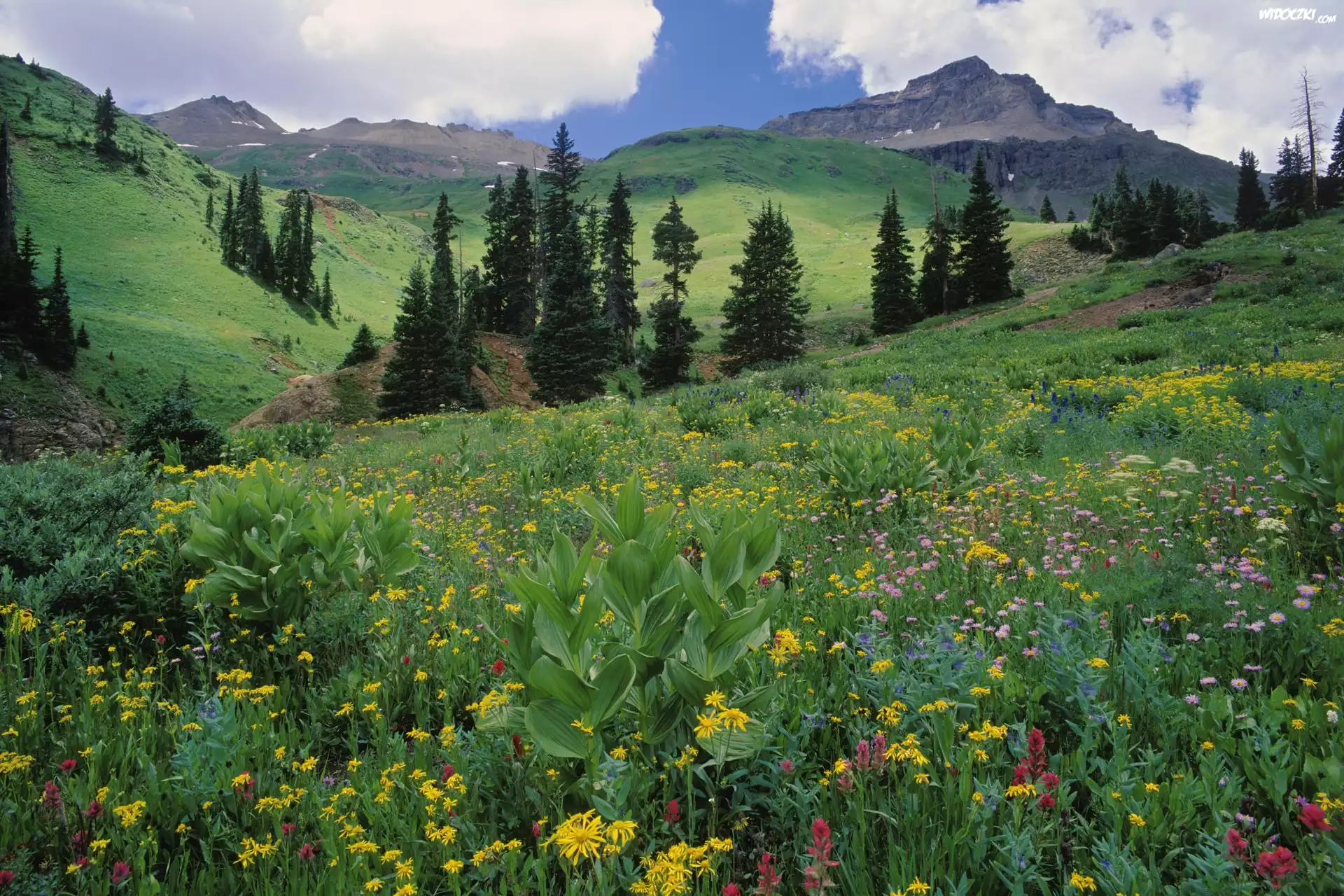 Zdjęcia, Łąka, Kwiaty, Drzewa, Góry