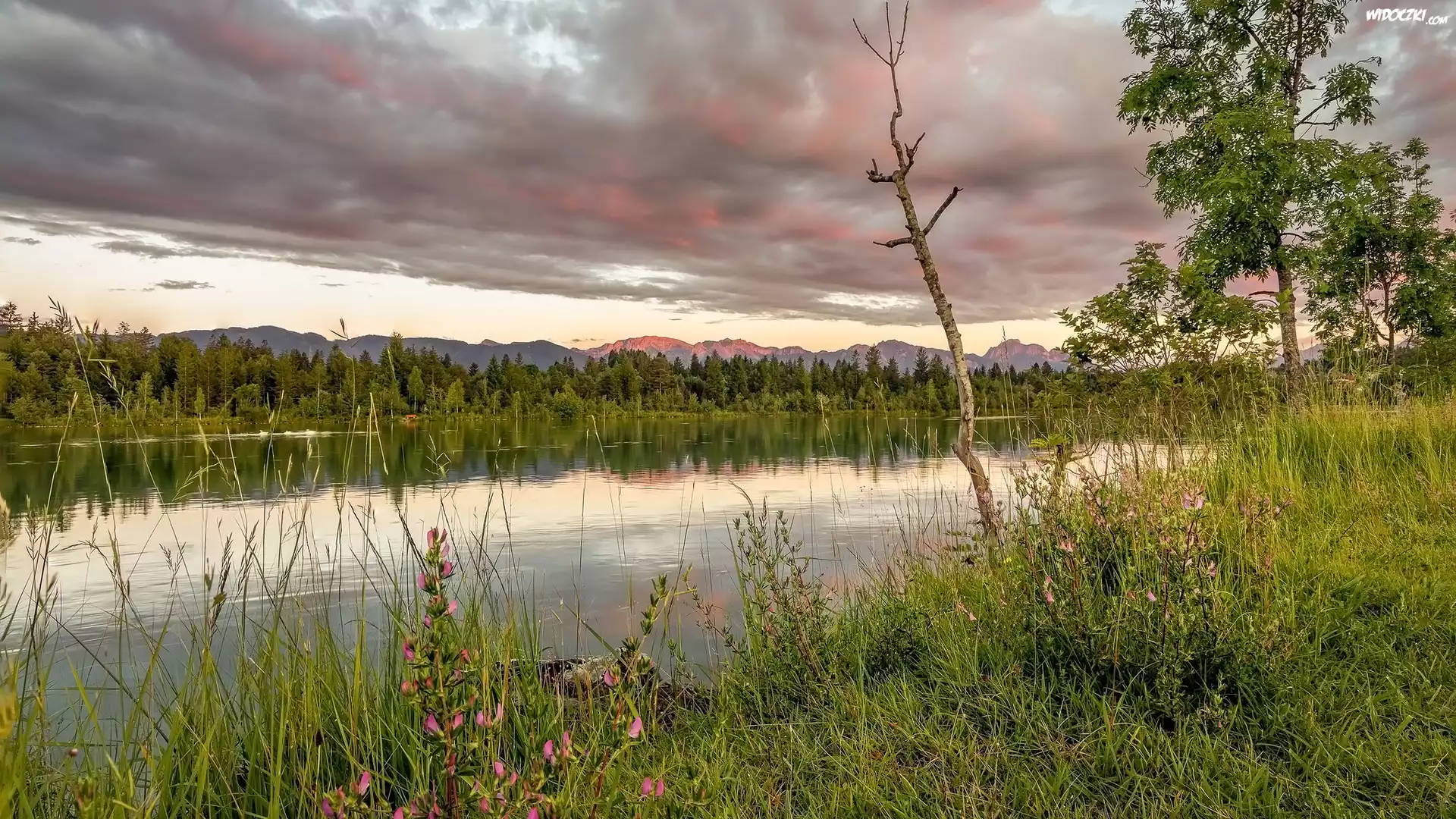 Zdjęcia, Rzeka, Drzewa, Kwiaty, Trawa, Góry