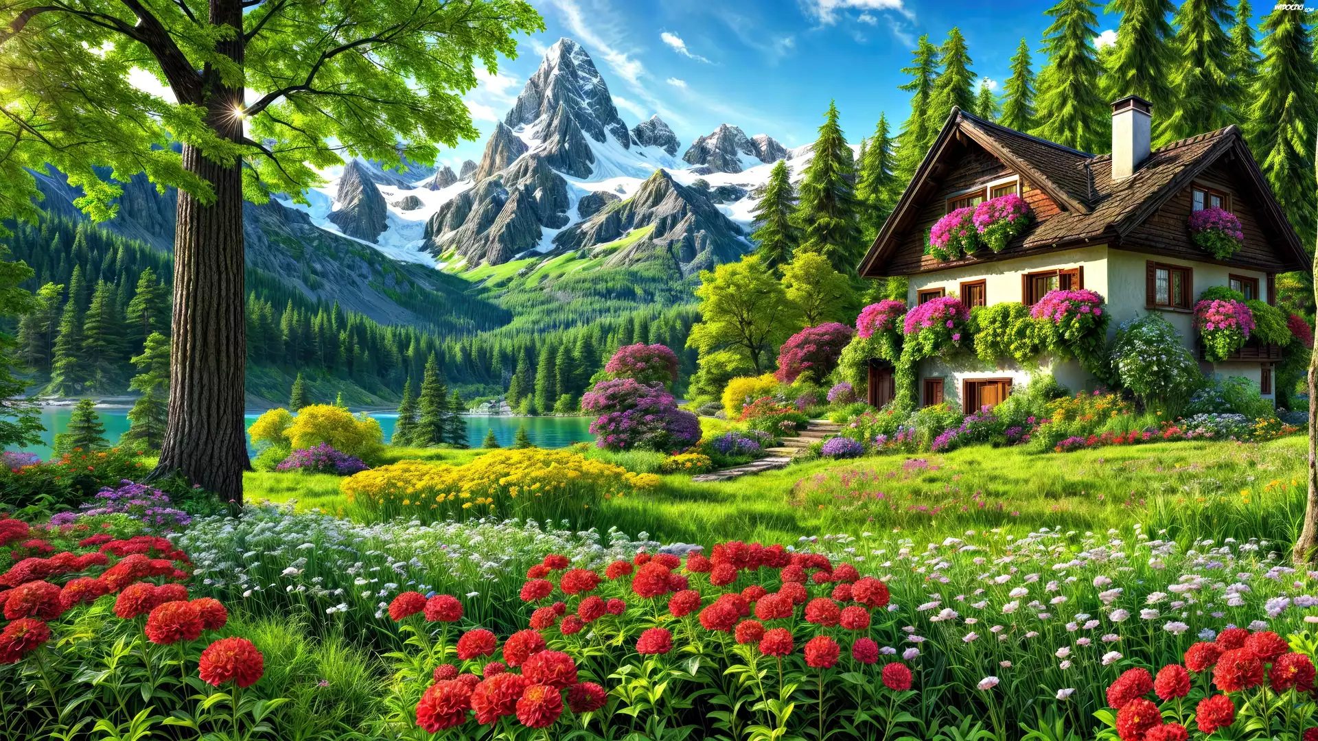 Zdjęcia, Dom, Drzewa, Kwiaty, Góry, Grafika