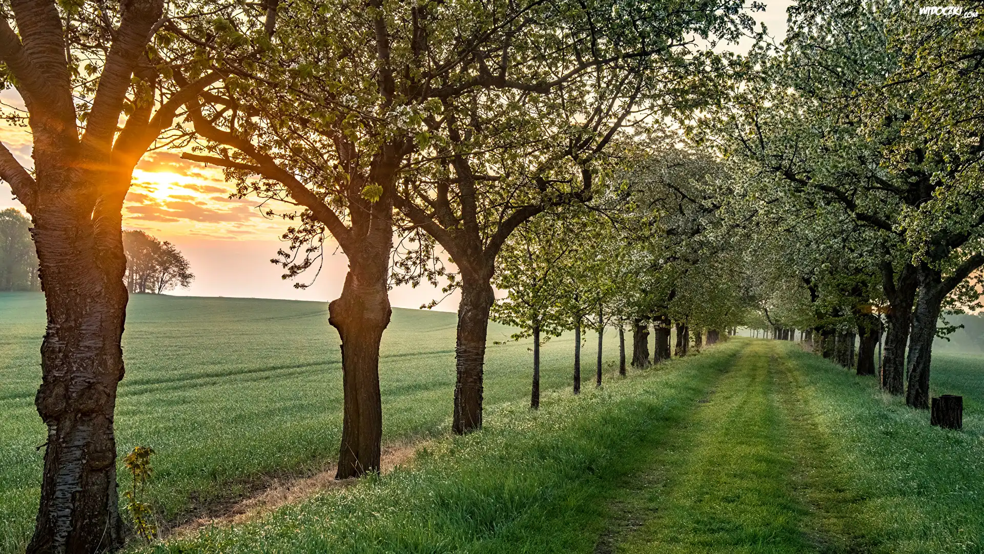 Zdjęcia, Kwitnące, Drzewa, Trawa, Wschód słońca, Droga, Wiosna