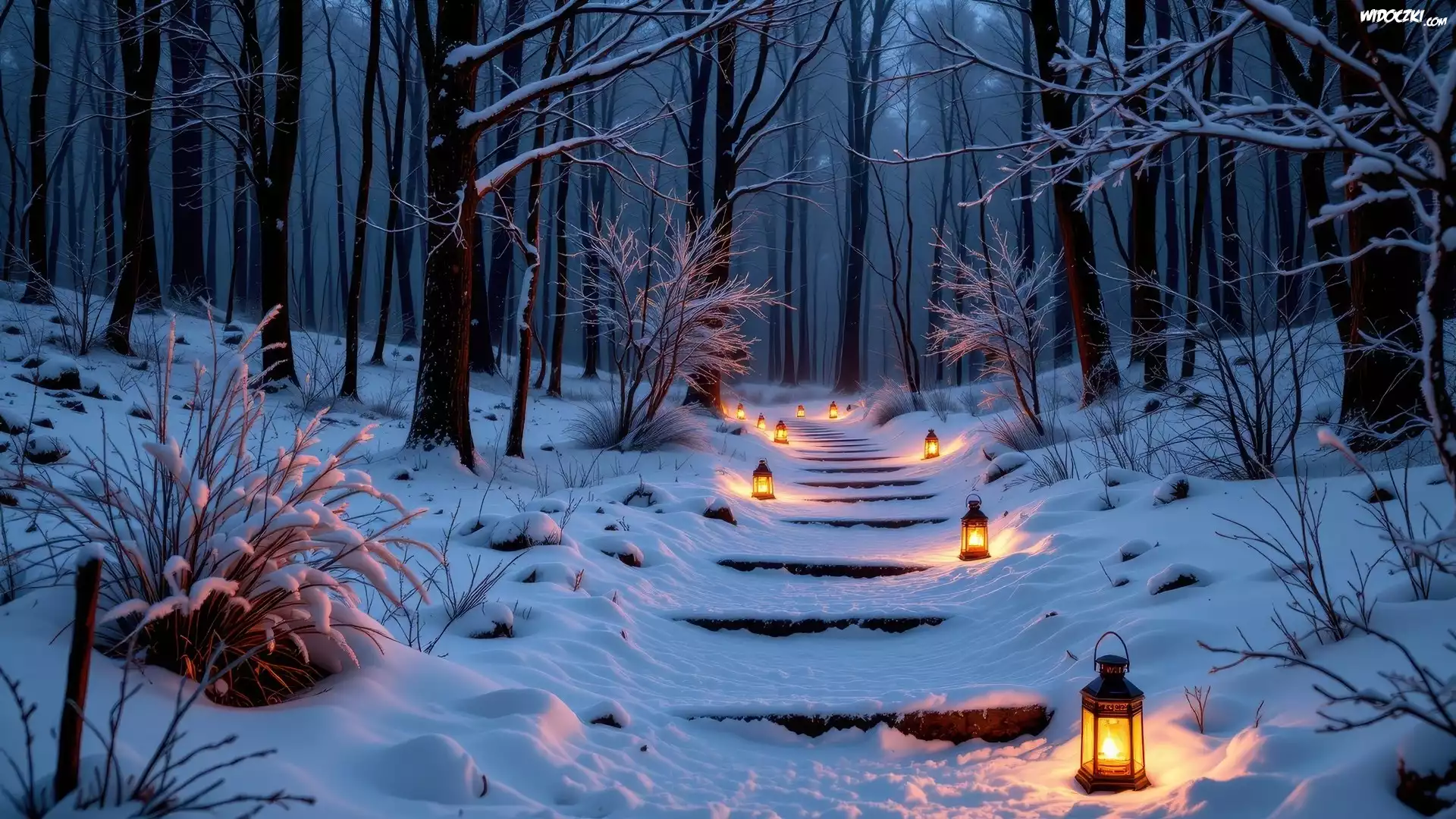Zdjęcia, Zima, Las, Ośnieżone, Drzewa, Schody, Lampiony