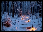 Zima, Las, Ośnieżone, Drzewa, Schody, Lampiony