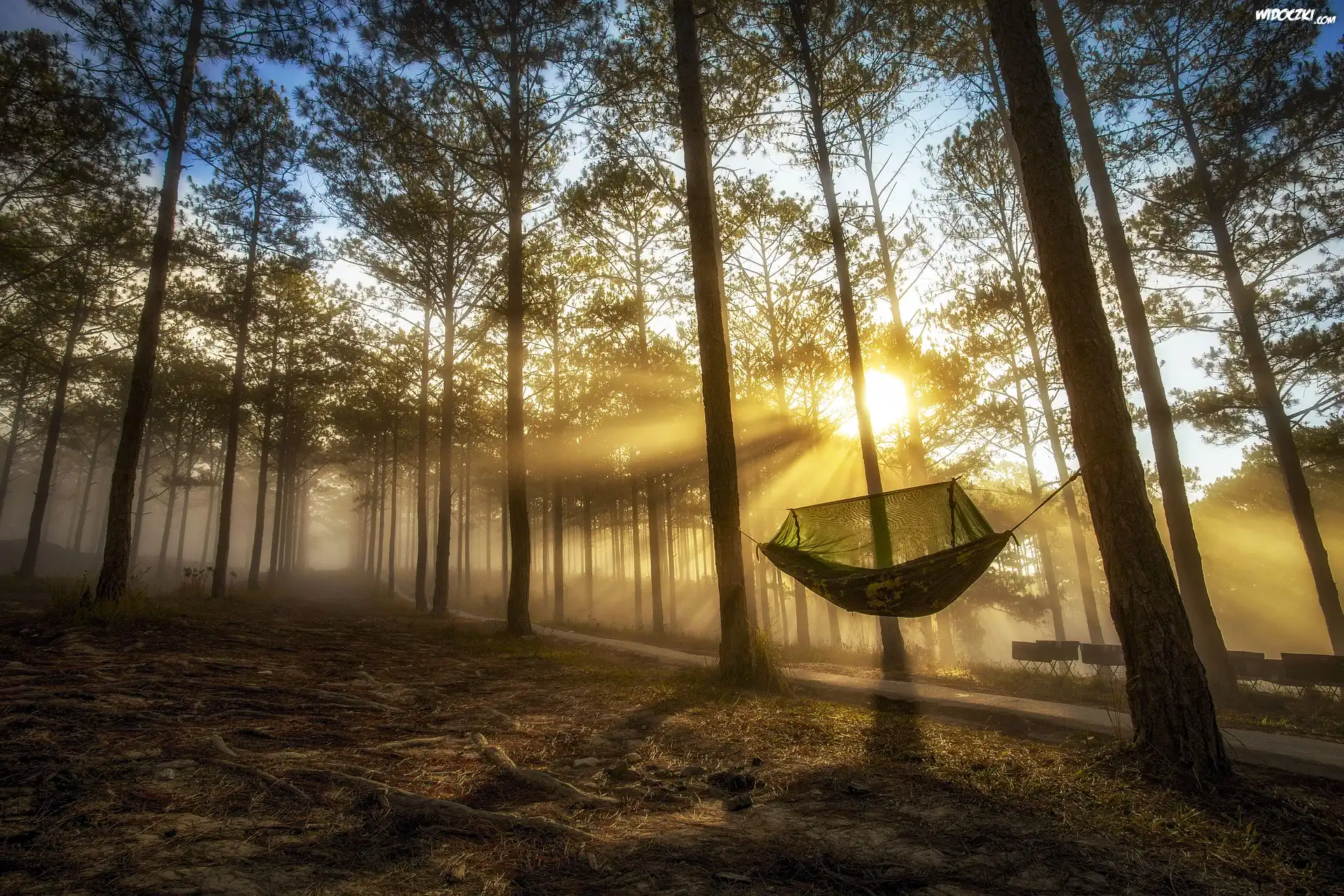 Zdjęcia, Las, Drzewa, Wschód słońca, Siatka, Paśniki, Droga