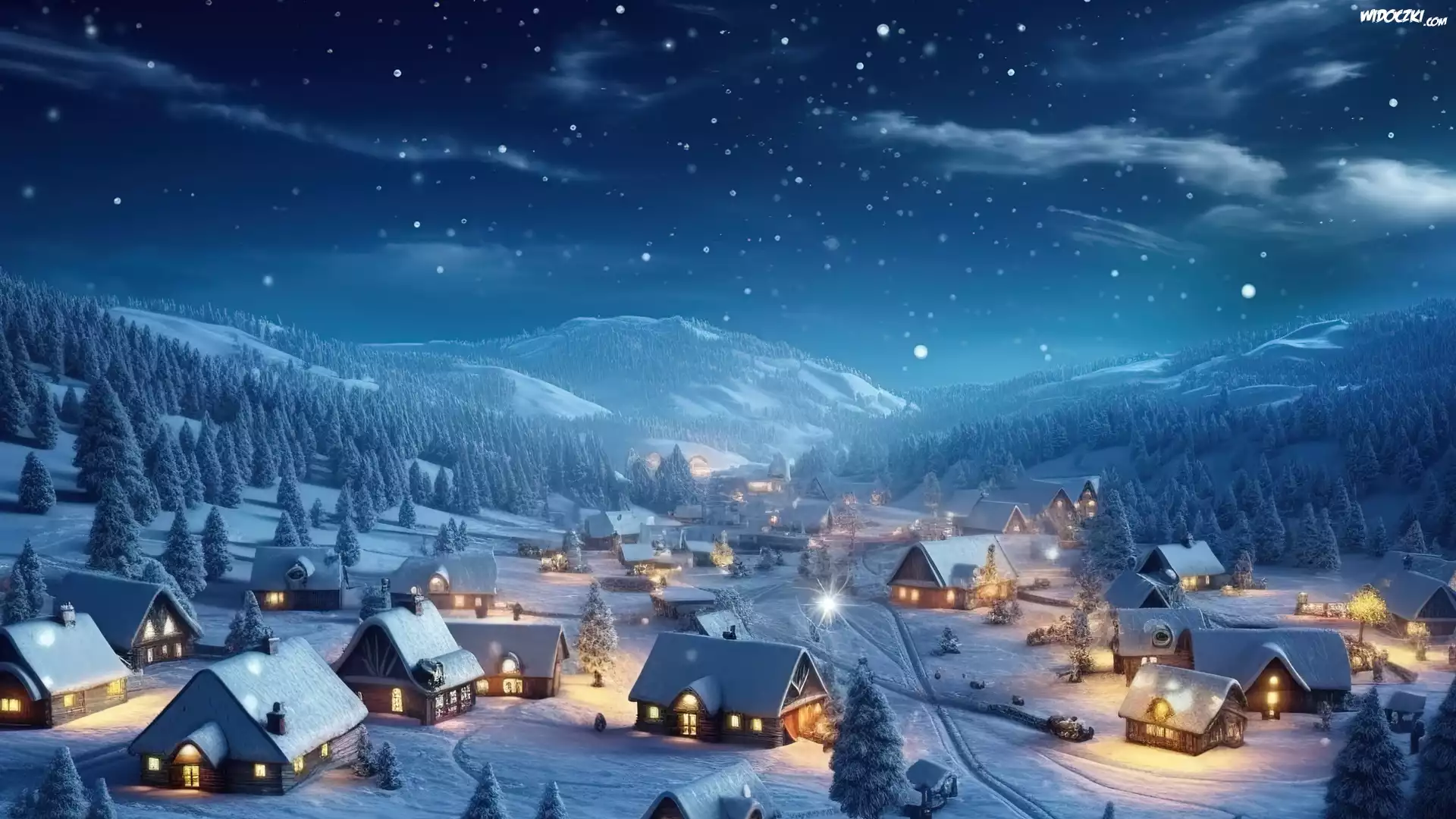 Zdjęcia, Zima, Góry, Las, Drzewa, Domy, Światła, Grafika