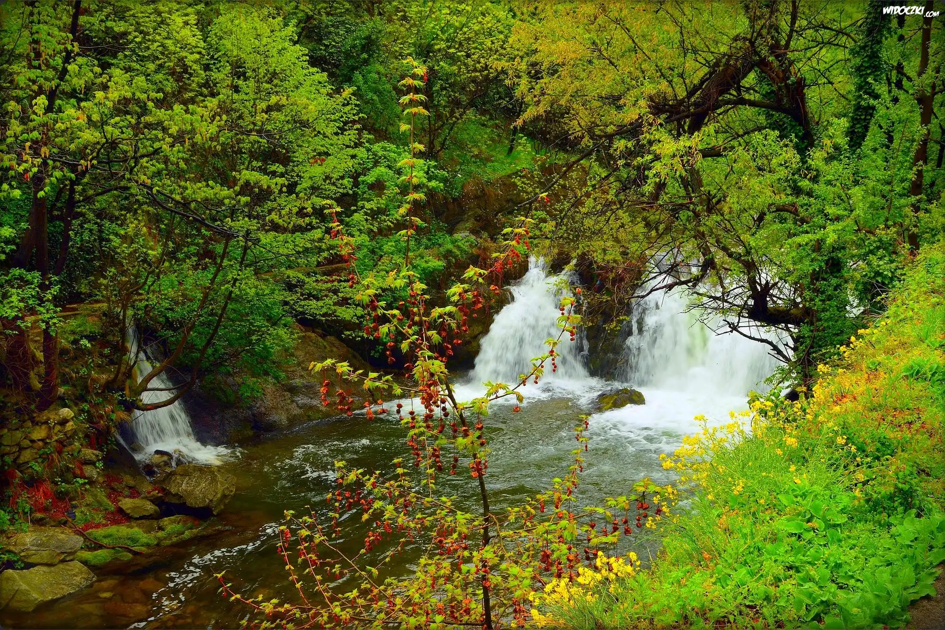 Zdjęcia, Las, Drzewa, Wodospad, Skała, Rzeka, Kamienie, Jesień