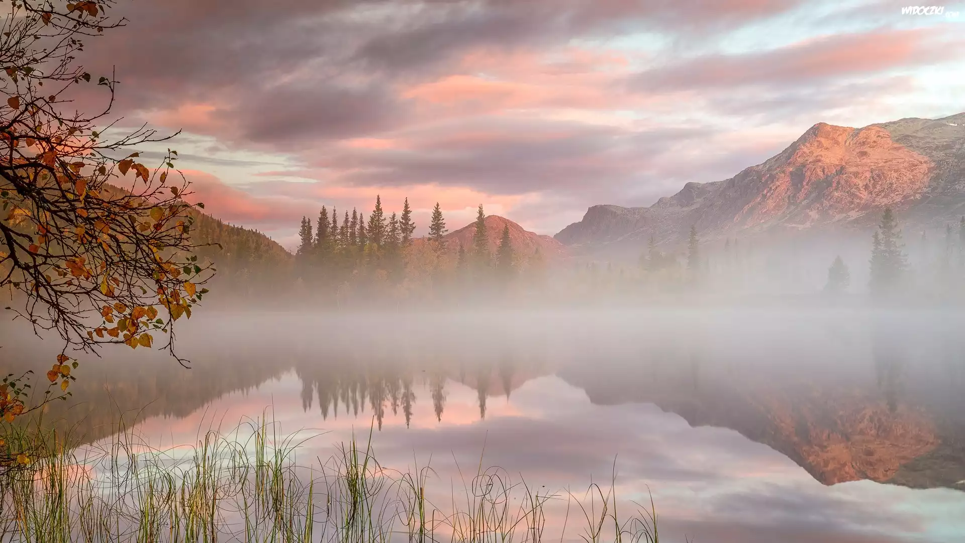 Góry, Jezioro, Las, Drzewa, Mgła, Chmury, Odbicie