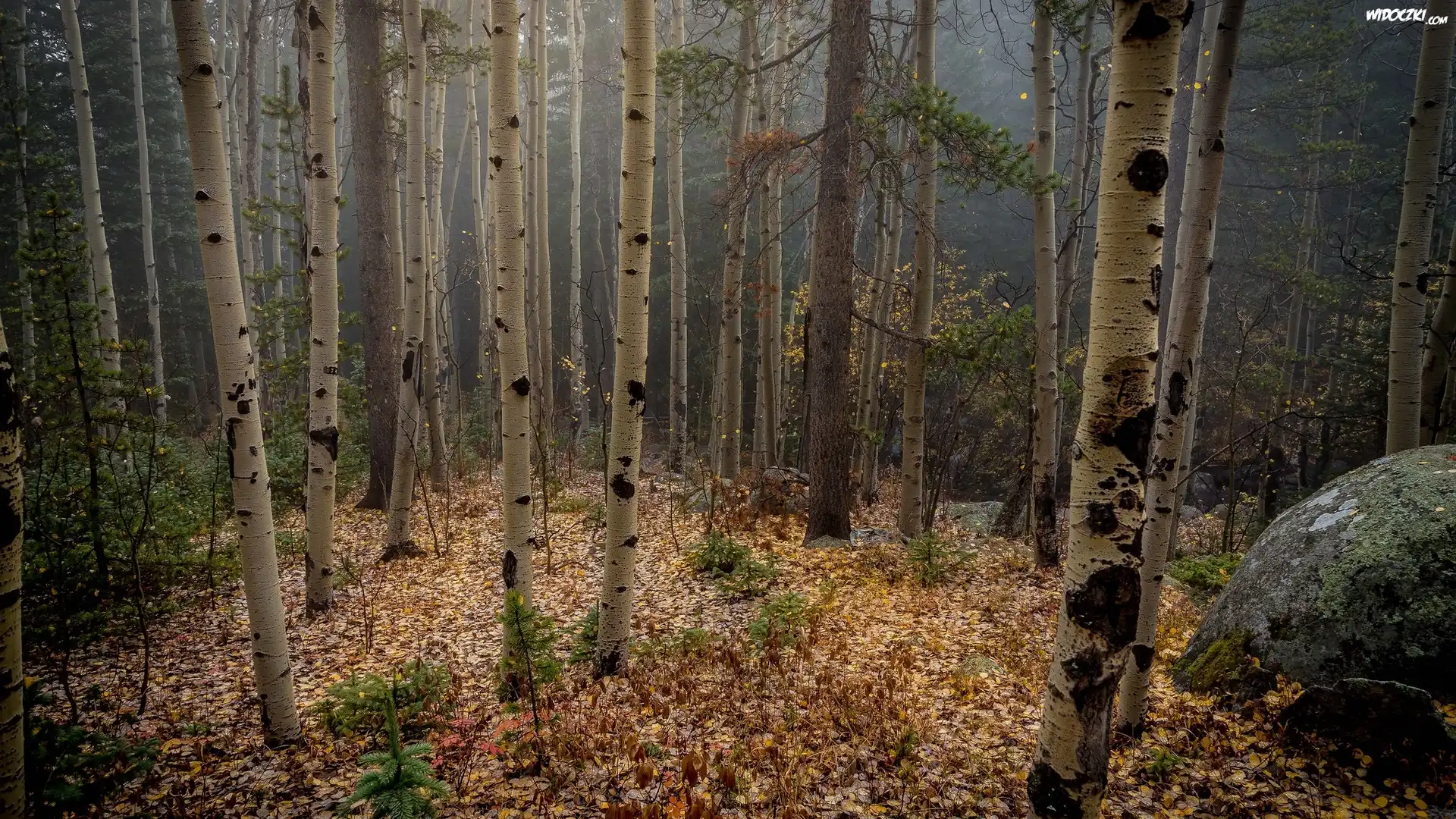 Las, Drzewa, Topole osikowe, Opadłe, Liście, Kamień