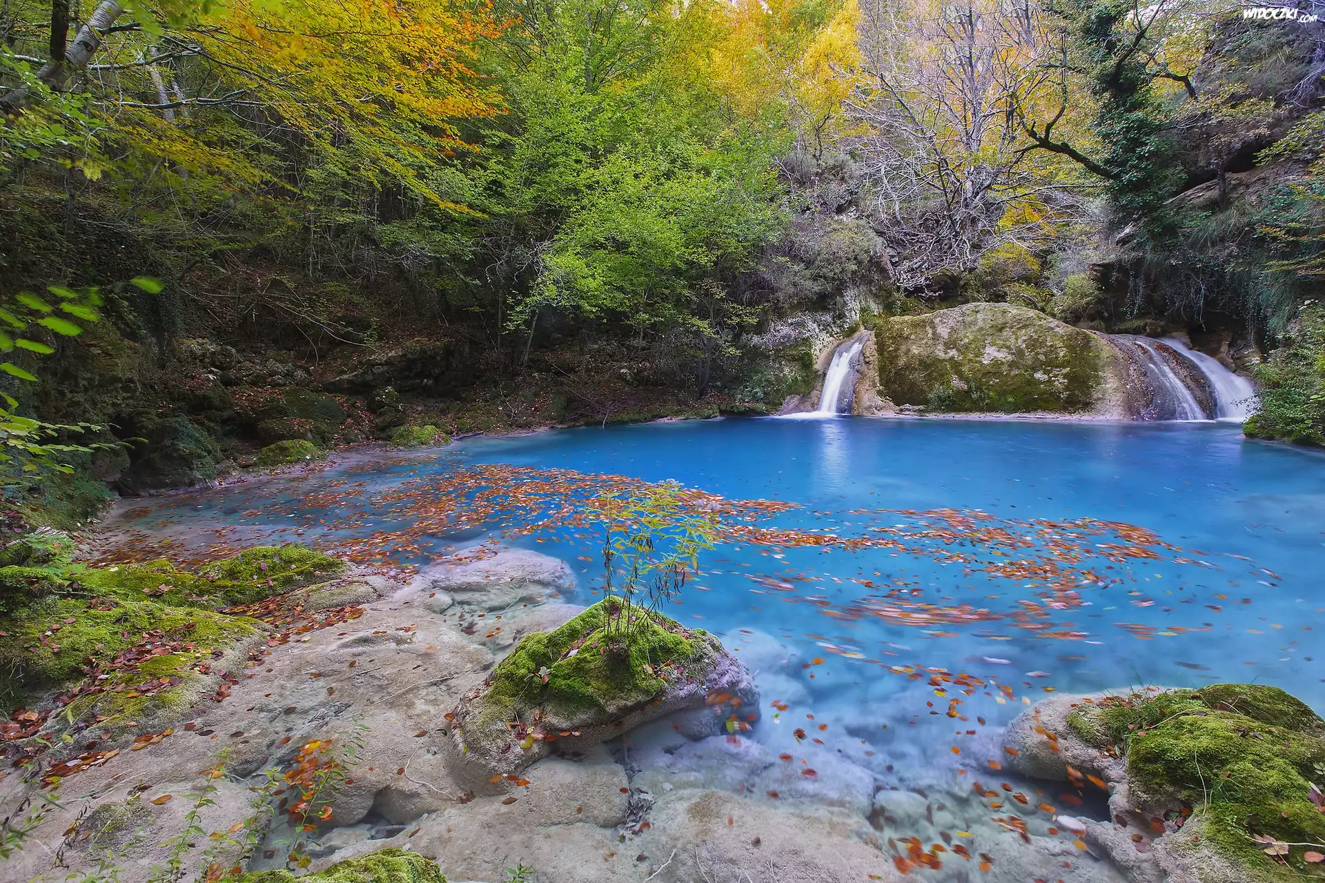 Zdjęcia, Las, Drzewa, Rzeka, Niebieska, Woda, Skały, Liście