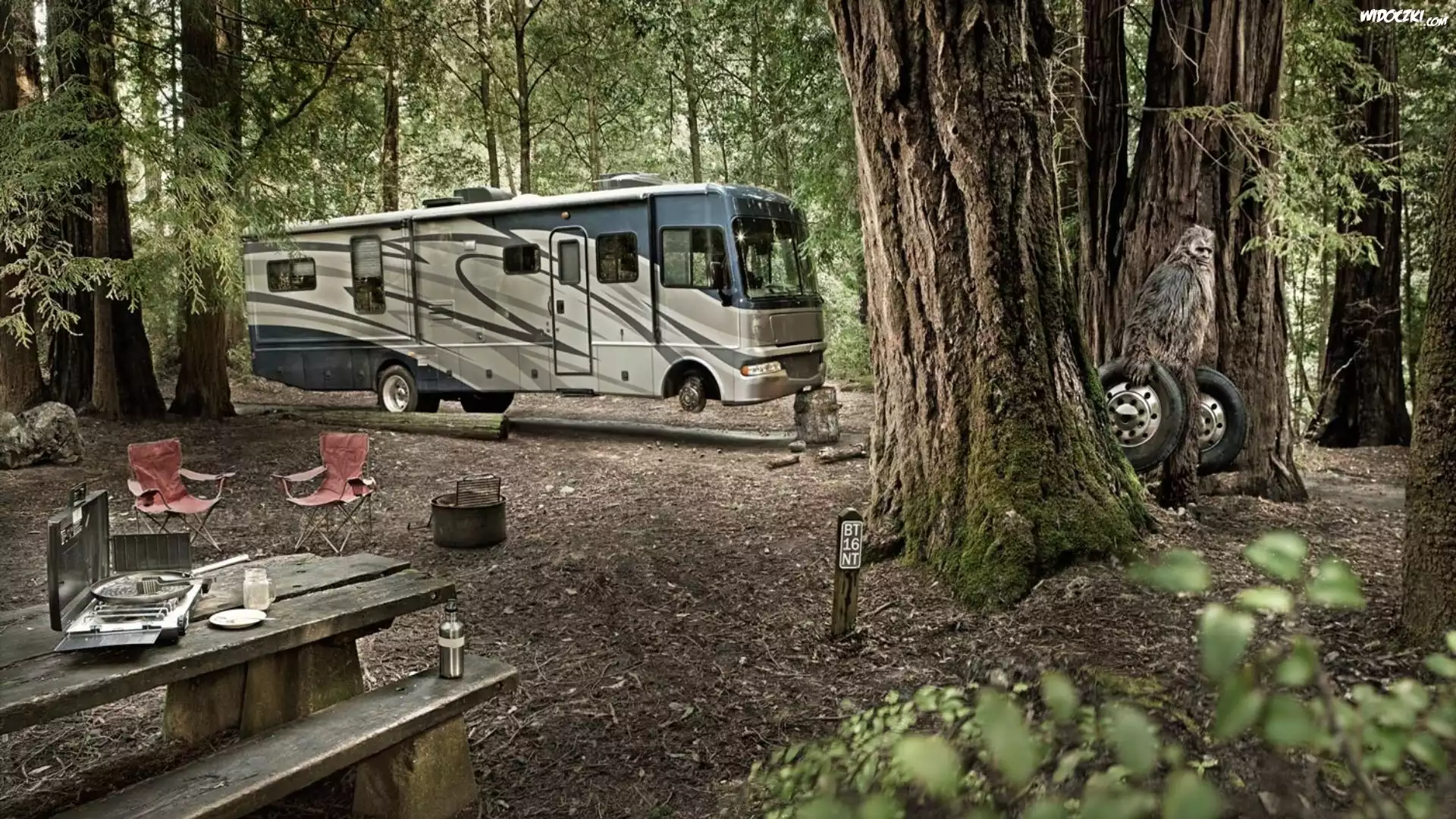 Las, Drzewa, Stolik, Krzesła, Stary, Autobus, Małpolud