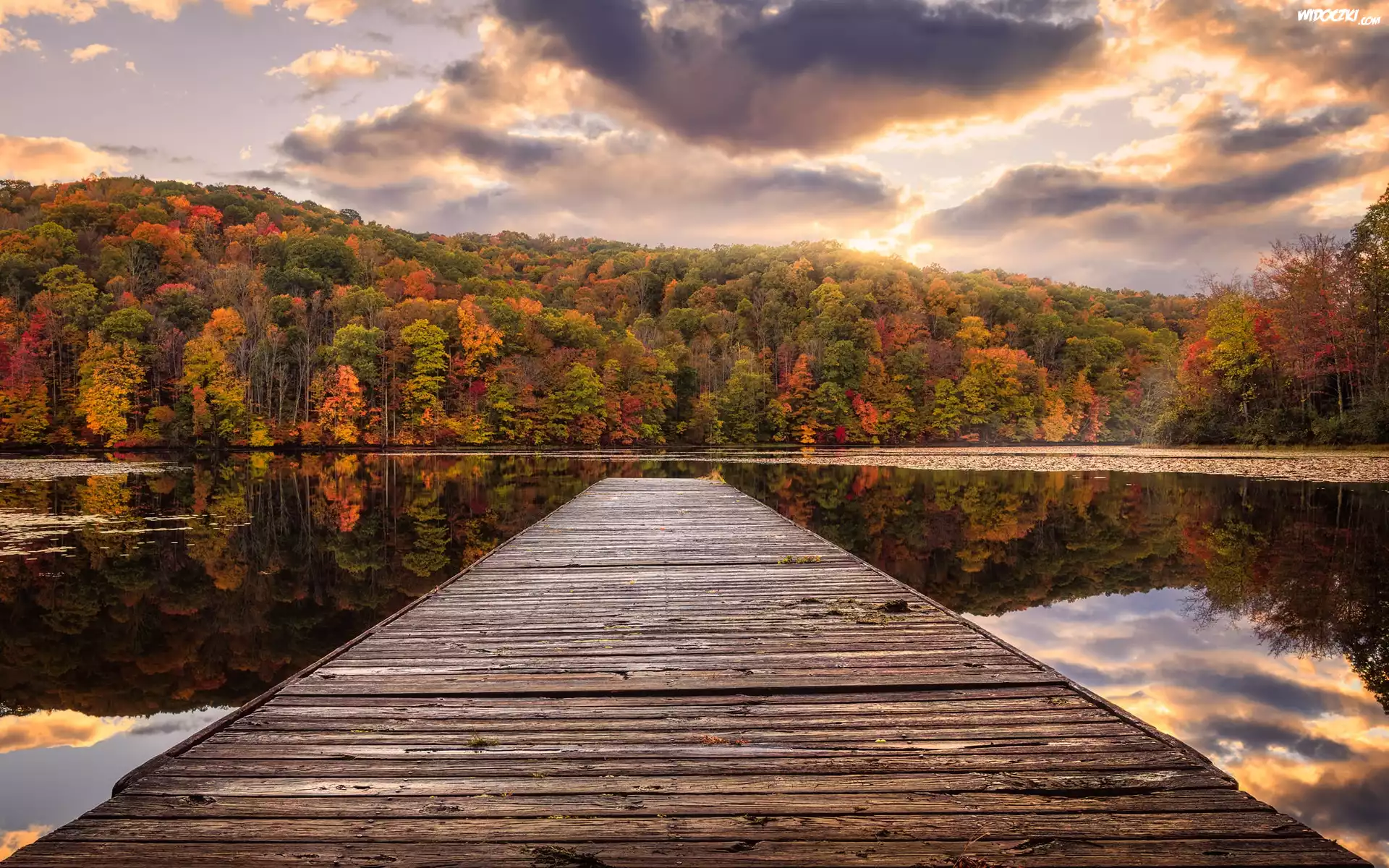 Jezioro, Pomost, Las, Drzewa, Jesień, Chmury, Odbicie